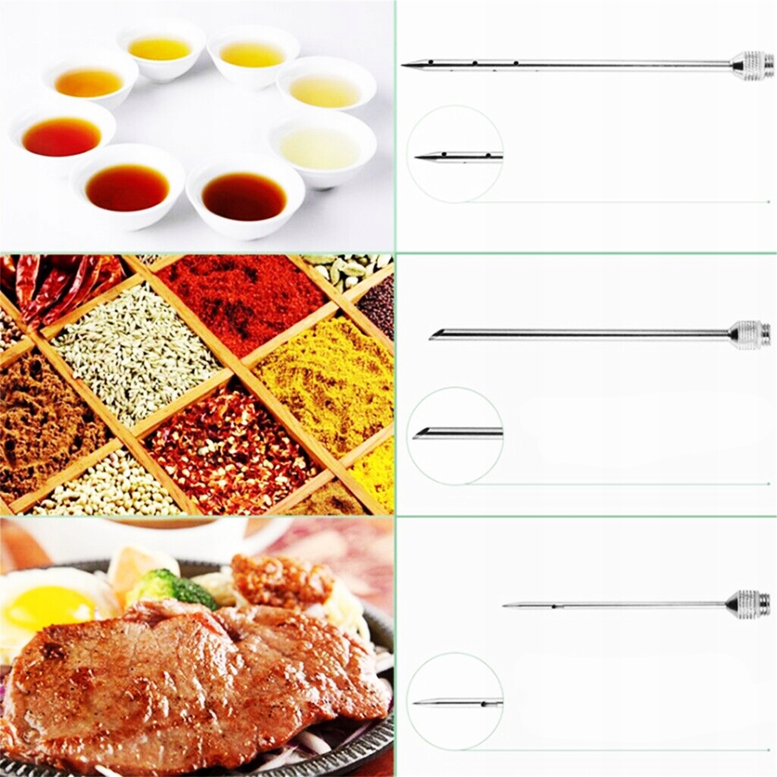 - The first needle with a wide outlet is ideal for applying marinades with large pieces of spices The needle with many holes at different heights guarantees even meat rectum