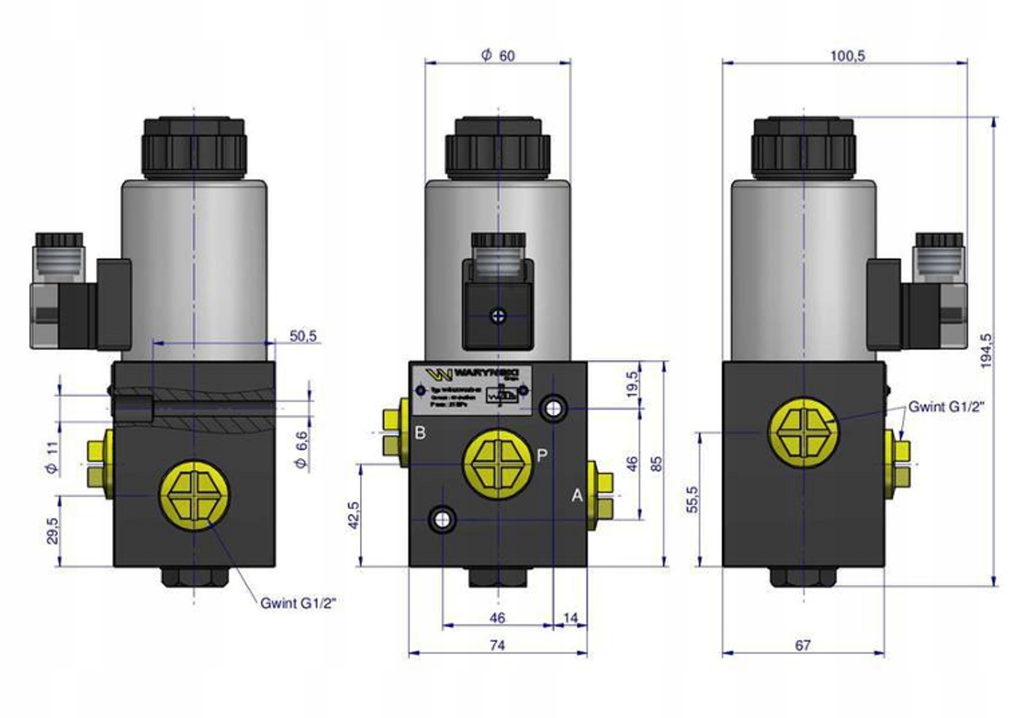 3-ходовий електромагнітний керуючий електромагнітний клапан 3/2 W-E12DVS3/2-80L G1/2" 12V 80L Waryński.