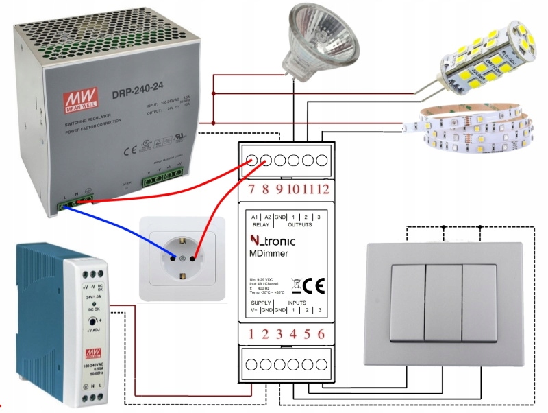 Живлення світлодіодного диммера від двох джерел живлення дозволяє економити енергію. Головне джерело живлення, що працює весь час, може мати низьку потужність, тоді як другий джерело живлення, що живить джерело світла (вищої потужності), може керуватися релейним виходом. Він закритий лише тоді, коли один із вихідних каналів увімкнено.