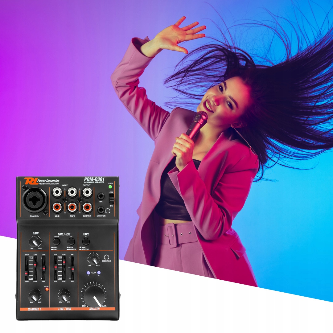 Компактний мікшер для невеликих додатків. Мікшер має один моновхід і один стереовхід, що робить цей мікшер ідеальним для використання стандартної звукової системи для музики та мови (мікрофон). PDM-D301 має 2-смуговий еквалайзер для регулювання високих і низьких тонів. Мікшер оснащений USB портом для підключення до ноутбука або комп'ютера. Змішувач також живиться через USB-з’єднання.