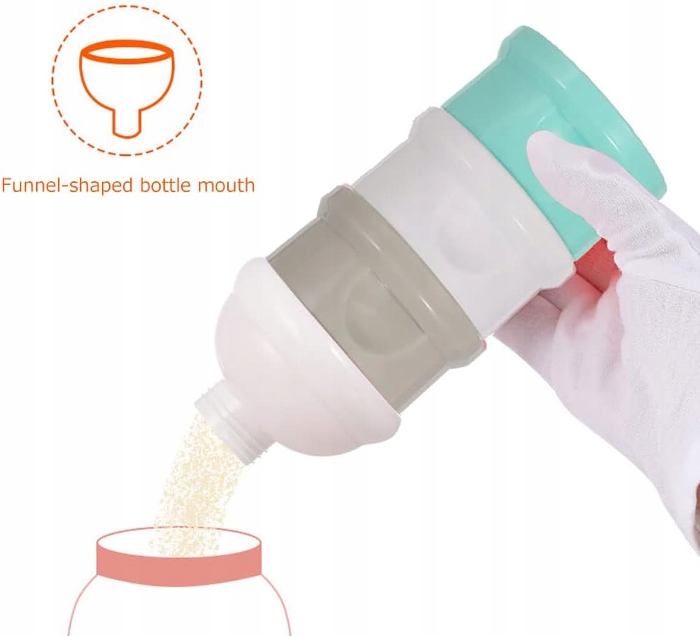 Висока якість Ця коробка для молока для дітей виготовлена з високоякісного харчового поліпропіленового матеріалу, міцного, без запаху, бісфенолу А та нешкідливого для здоров’я дитини. Легкий, простий у чищенні та довговічний. Багатошарова конструкція 3 знімні маленькі пляшечки з-під сухого молока можуть містити різні продукти харчування окремо. Воронкоподібний отвір підходить для пляшок з молоком різного діаметру, і сухе молоко не буде виливатися у відходи. Одна коробка сухого молока може вмістити 60 г сухого молока. Приблизно 7 столових ложок. Герметичне зберігання Різьбова герметична конструкція забезпечує герметичність коробки для зберігання, завдяки чому сухе молоко не піддається впливу вологи, залишається свіжим і не має специфічного запаху. Легко носити Розмір 75 см x 75 см x 236 см. З м’яким силіконовим шнурком, його зручно носити. Компактний розмір ідеально підходить для рюкзака або сумочки. Поверхня має нековзку канавку, що полегшує захоплення. Широкий спектр застосування Цей міцний герметичний контейнер для сухого молока також можна використовувати для зберігання фруктів, прикорму, закусок, цукерок, горіхів тощо, тому ви можете готувати молоко та закуски для своїх дітей будь-коли та будь-де.
