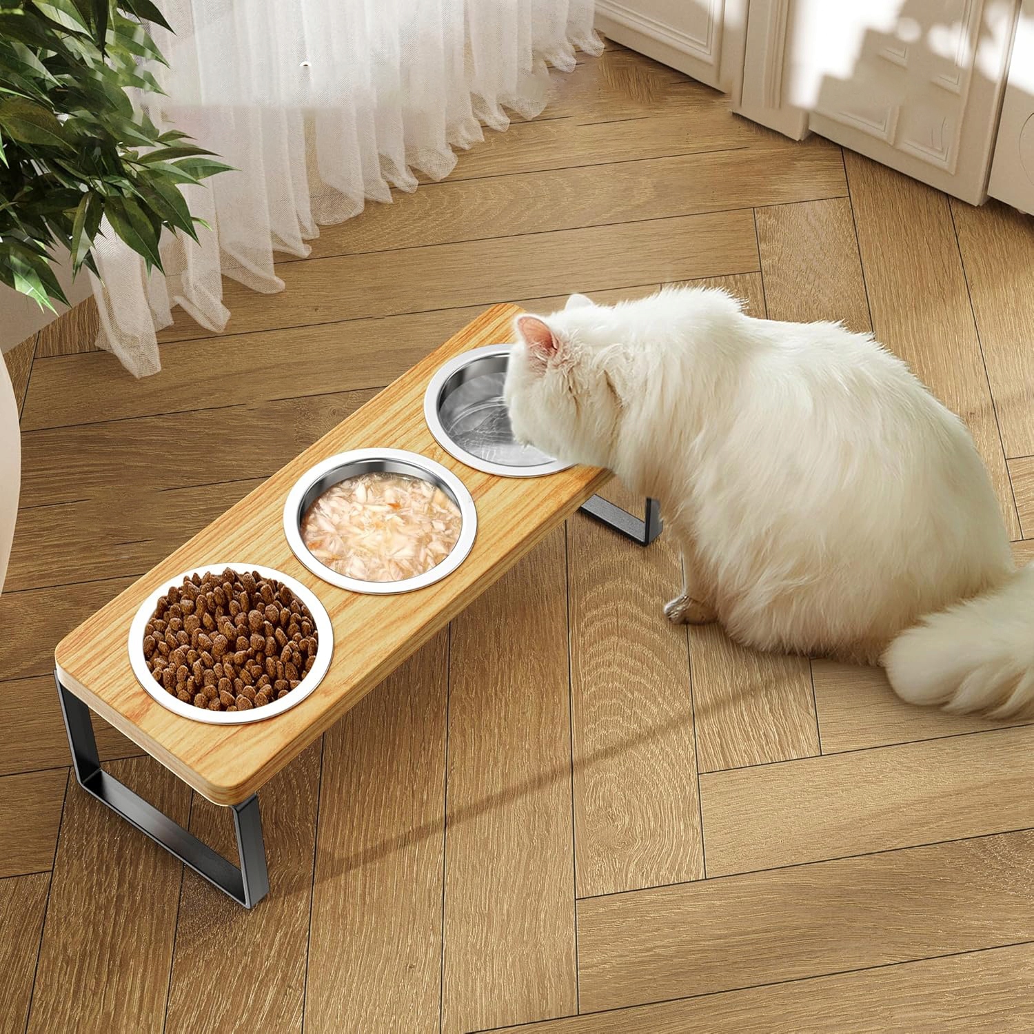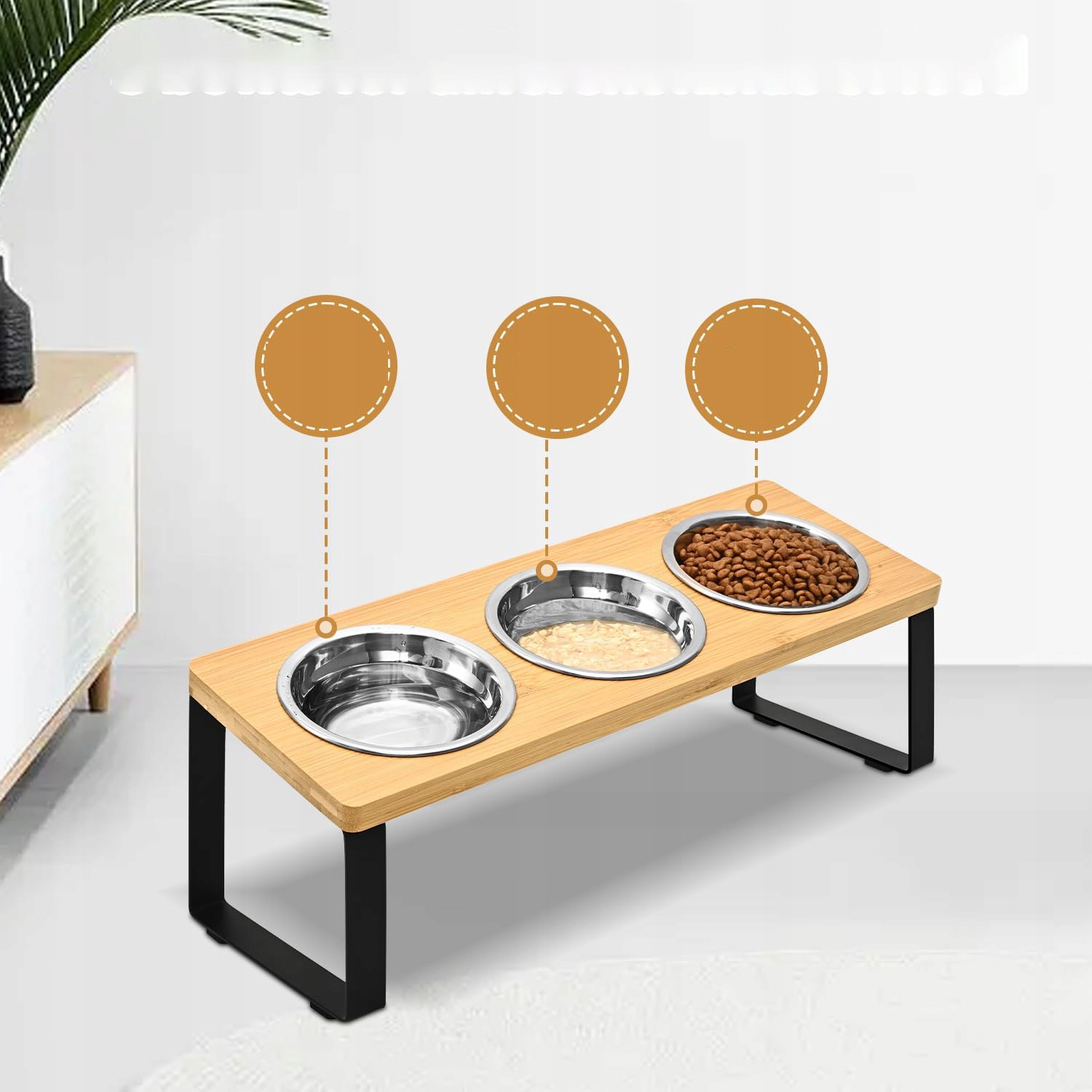 Набір містить одну бамбукову металеву підставку розміром 42 x 14,5 x 13,5 см і три миски з нержавіючої сталі діаметром 11,5 см. Ці миски помірного розміру мають плоске дно, щоб ваш вихованець міг насолоджуватися їжею, не заважаючи зоні годування. Три миски дозволяють котам вибирати з більшої різноманітності кормів. Чотири нековзкі гумові ніжки забезпечують стійкість, запобігають ковзанню та захищають підлогу від подряпин.