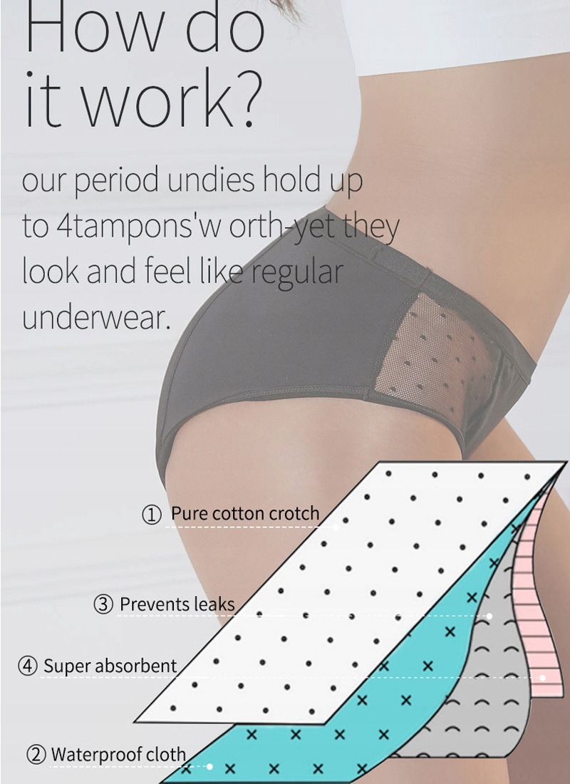 Ви надягаєте те саме, що й окремі, тільки менструальні, які не містять жодних додаткових засобів гігієни. Вони виконують роль гігієнічної прокладки, що є другорядним і є групою ризику. Через матеріал проходить менструальна кров, потім відбувається інсталяція, яка знаходиться в трусиках, захисний шар блокує її подальший відтік.