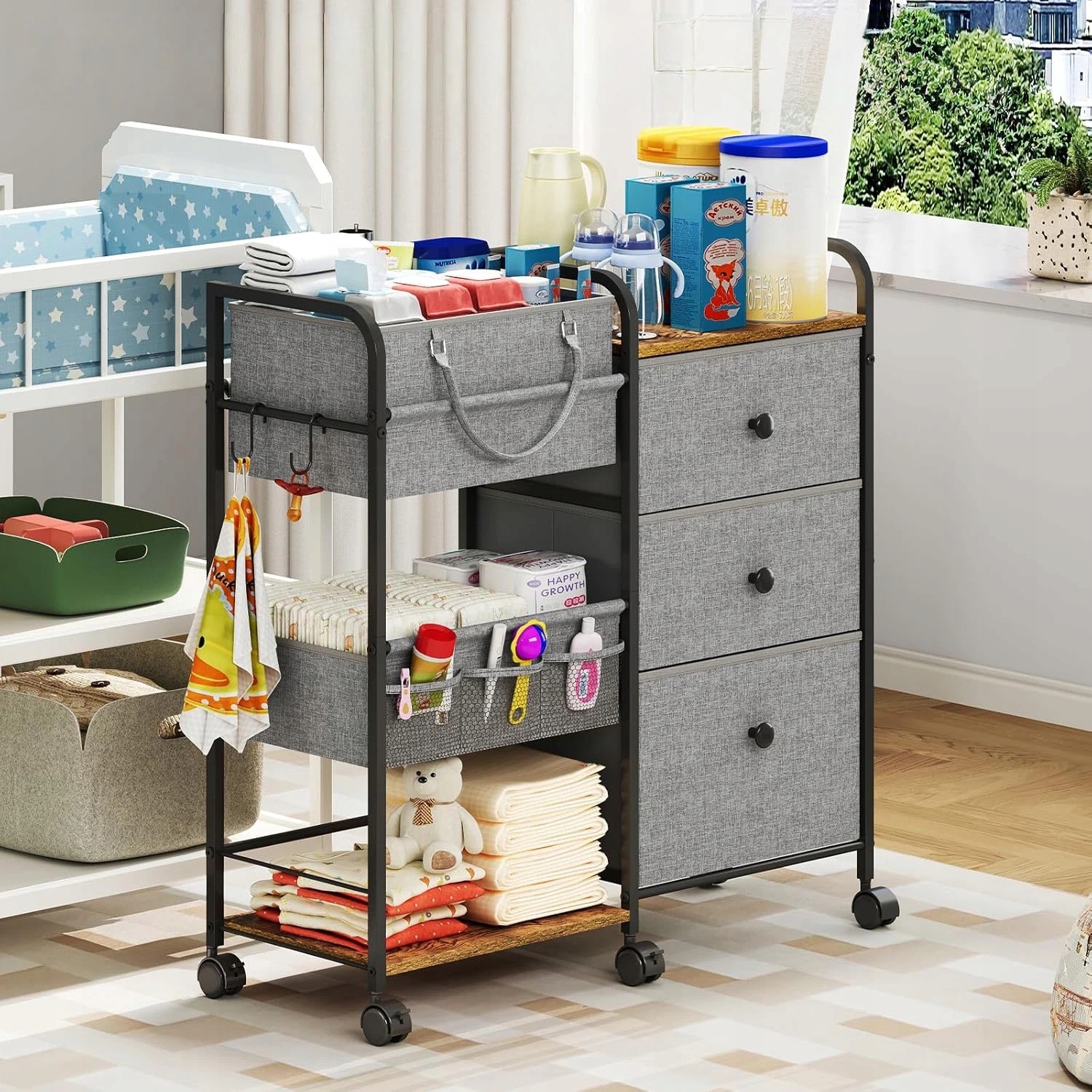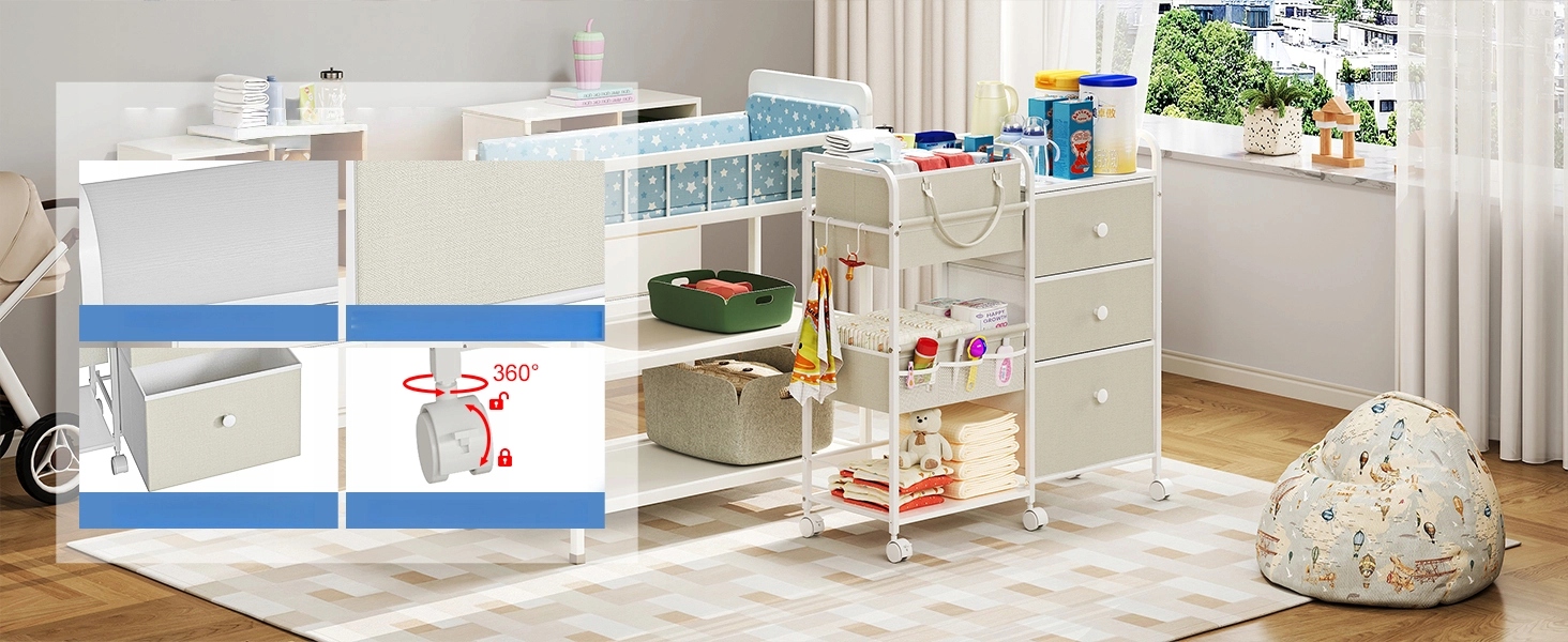 【Просте збирання】Цей ковзанок для підгузників є найкращим компаньйоном для молодих мам і немовлят, створений для зростання разом із сім’єю. Це більше, ніж просто органайзер для зберігання немовлят, це універсальне рішення для різноманітних домашніх потреб – від зберігання книг та іграшок до одягу, кухонних речей, косметики тощо. Легко в Цей візок-органайзер для підгузників легко зібрати для немовлят, він готовий до використання всього за кілька хвилин, що робить його практичним і стильним доповненням до будь-якої кімнати.