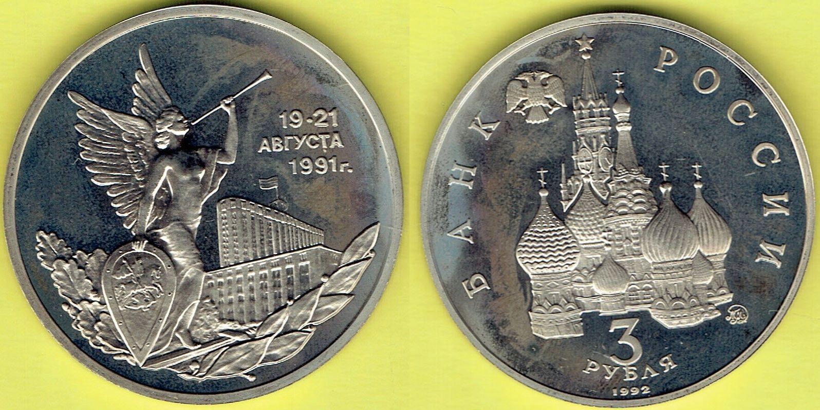 3 Ruble 1992 r. Rocz. Puczu Sierpniowego - Proof.