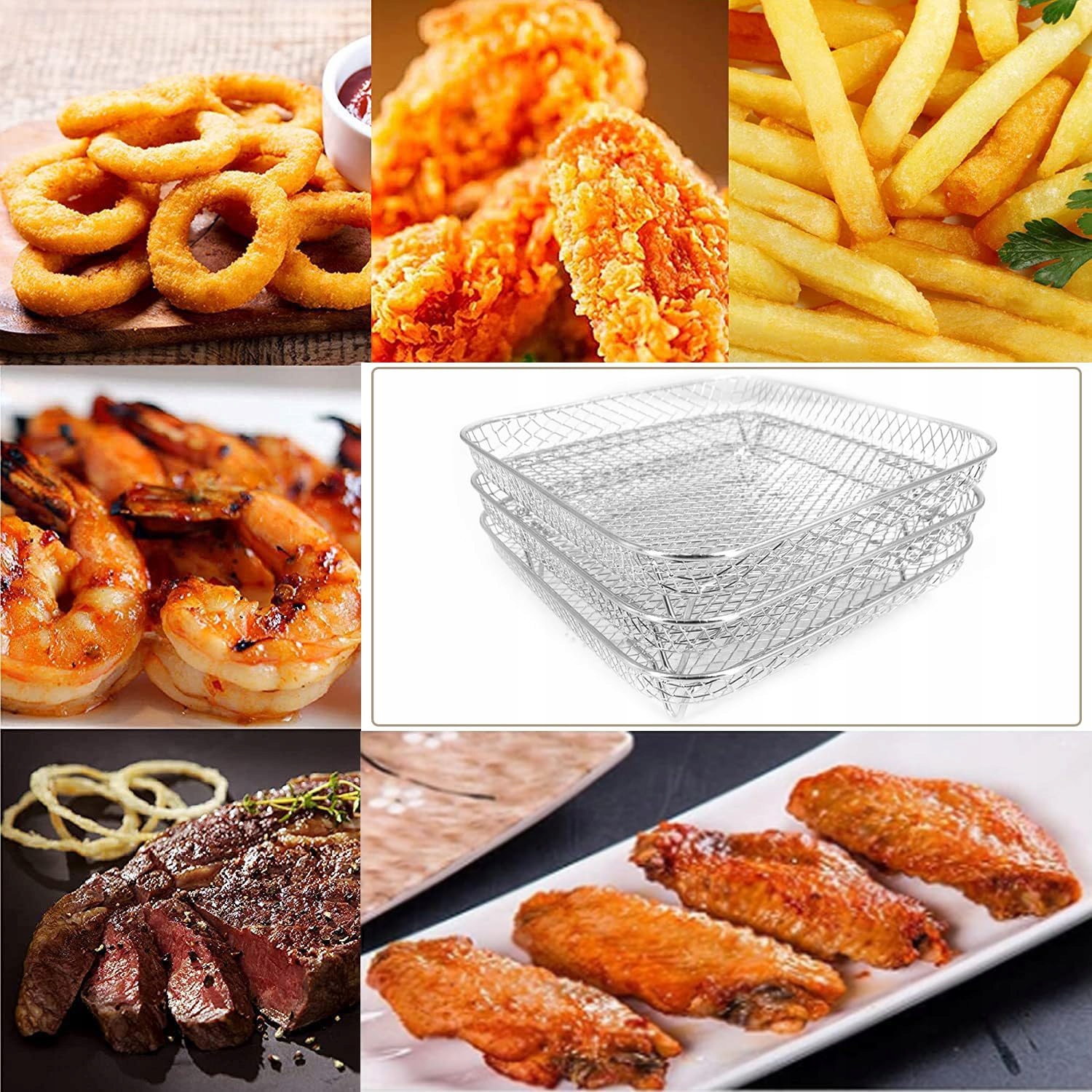 - Високоякісні матеріали -виготовлені з високої якісної 304 нержавіючої сталі, призначені для контакту з їжею, безпечним, нетоксичним, міцним, нержавіючим, стійким до високих температур, з гладкими краївами та без задирок. Стійки оточені сіткою, щоб переконатися, що їжа не впаде під час смаження або видалення. Конструкція решітки забезпечує оптимальну циркуляцію повітря та хрустку їжу. Перед покупкою перевірте розмір фрі з фрі перед тим, як зробити вибір. Він також може бути використаний як підставка для води або кошик для зберігання їжі, дуже практично.