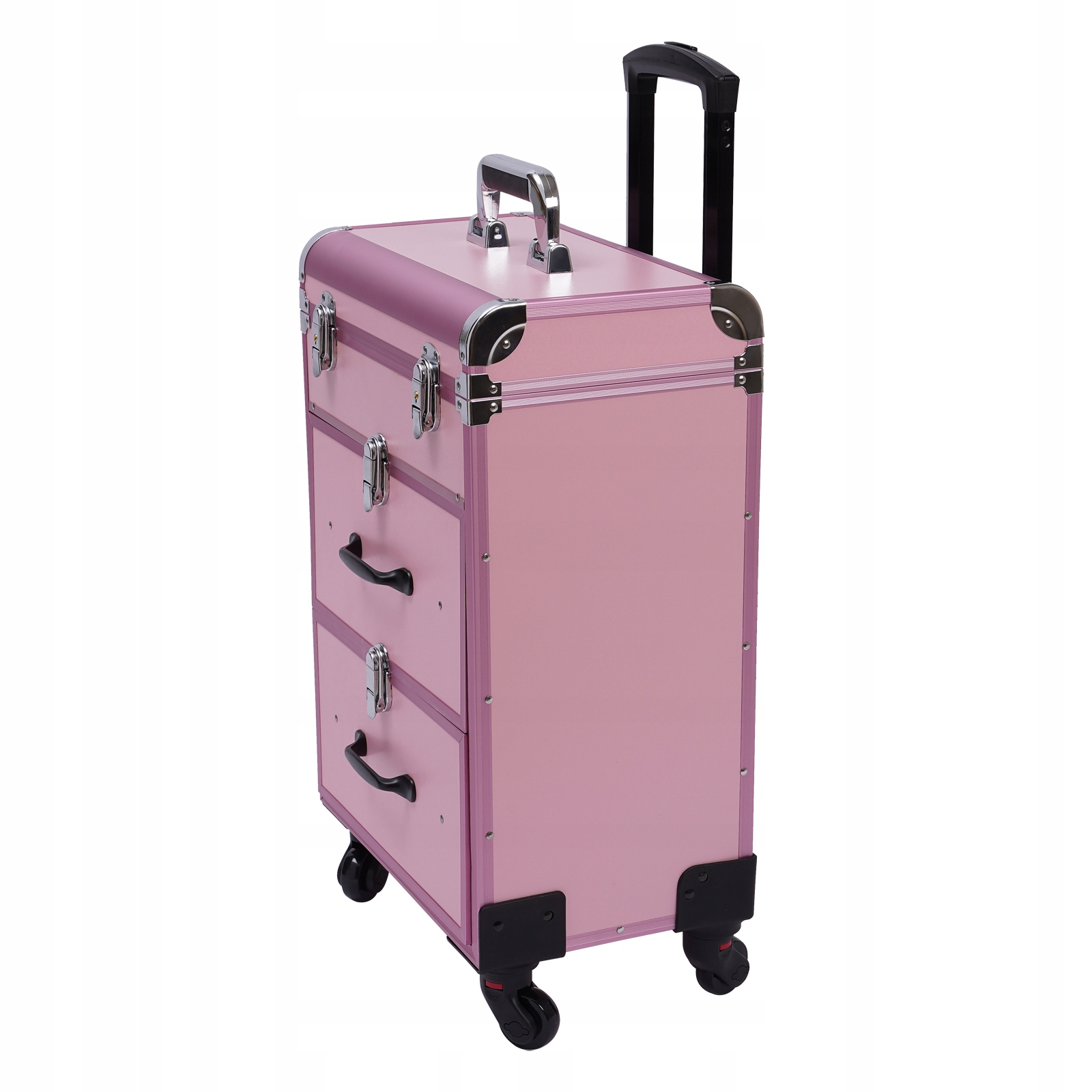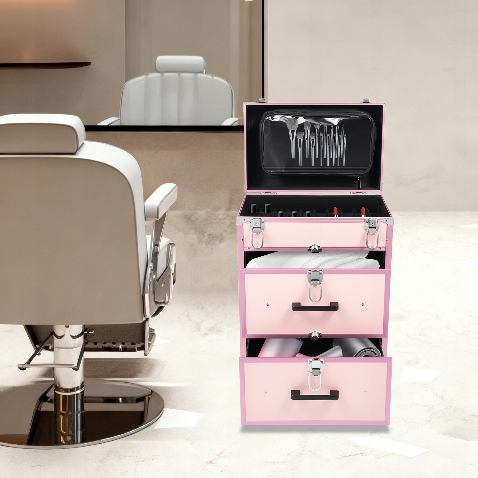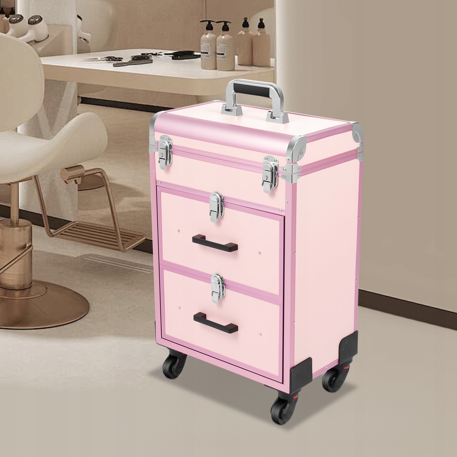 - Це рухомий багатошаровий косметичний чохол, призначений для професійних майстрів краси, які можуть робити макіяж у будь-який час і будь-де. Цей роликовий косметичний футляр виготовлений із високоякісного алюмінієвого сплаву, який є міцним і довговічним. Він має надзвичайно великі відділення та багатошарові ящики. Цей футляр ідеально підходить для тих, хто любить красу чи нейл-арт.