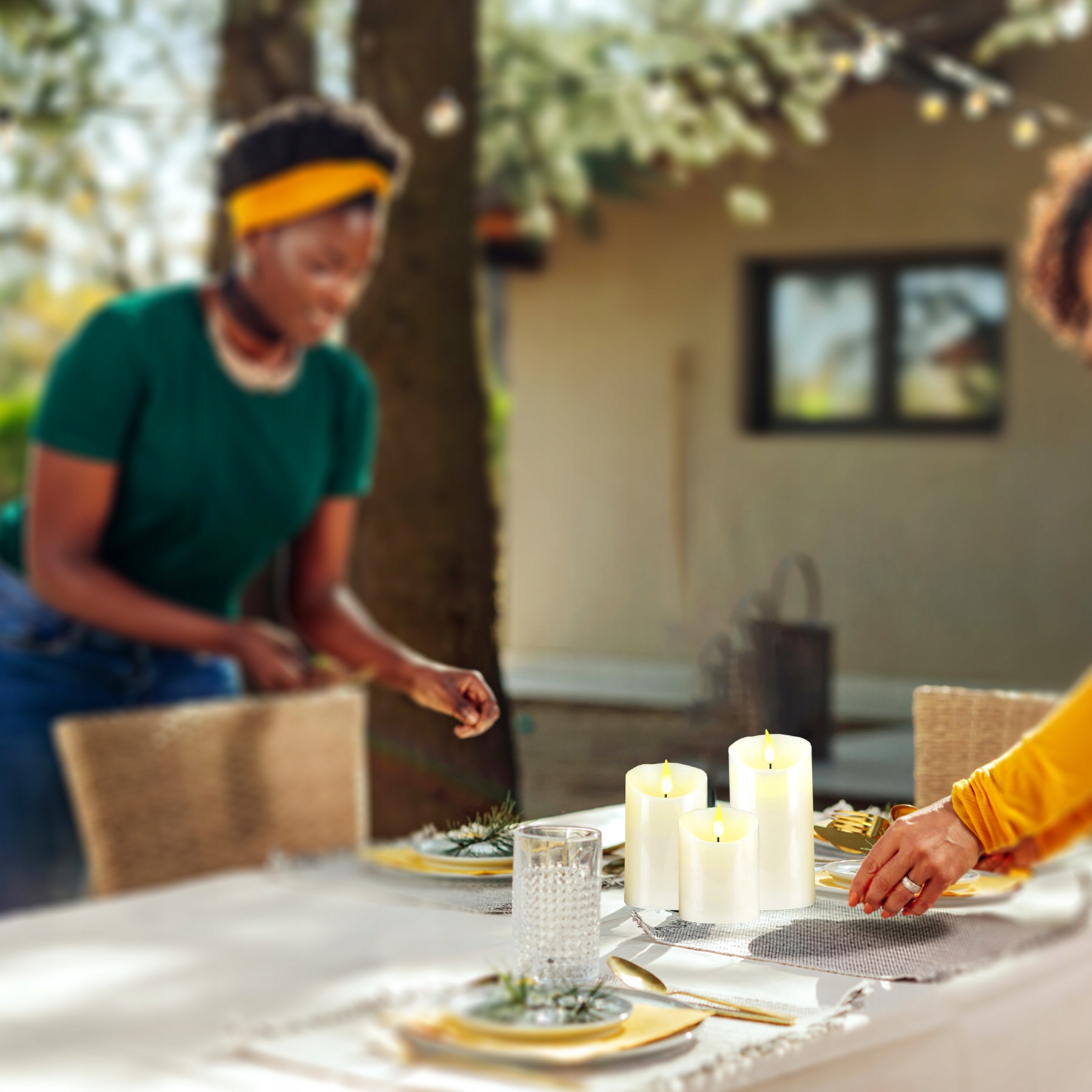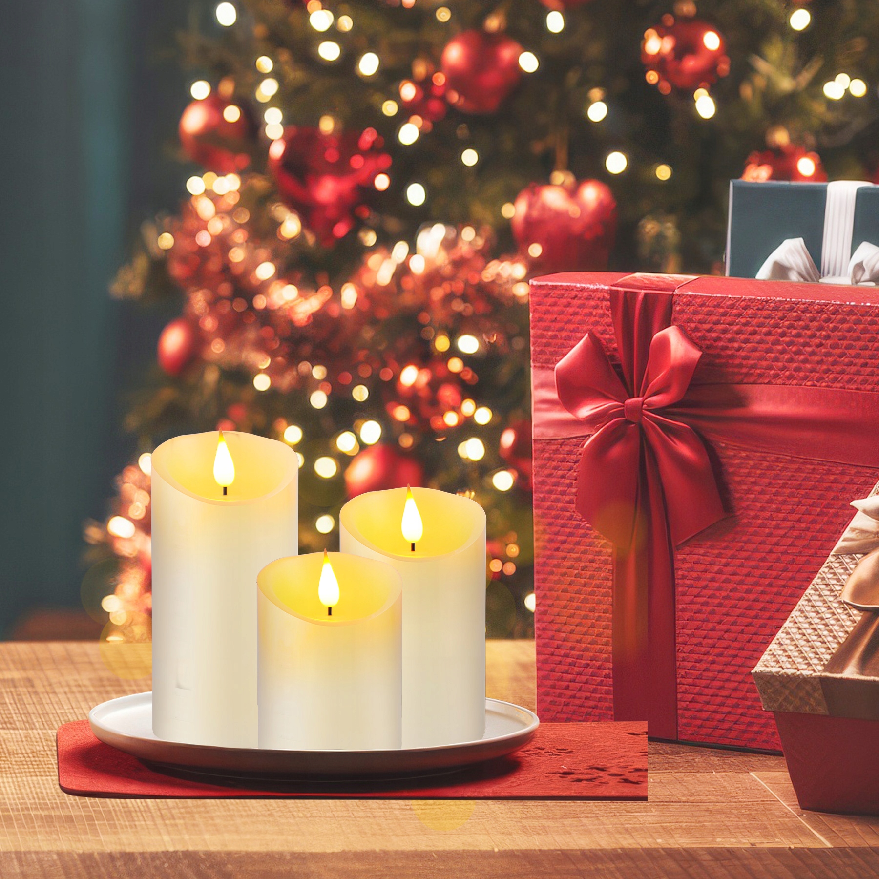 3D-ґноти та тепле світло роблять цю безполум’яну свічку-колонку більш придатною для різноманітних сценічних декорацій. Світло може відбиватися в парафіновому воску, який не тільки стає яскравішим, але й значною мірою імітує справжнє полум’я свічки.