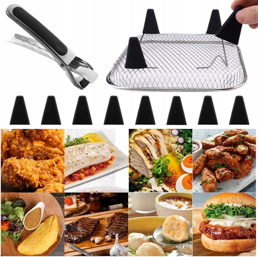 🔥🔥 Широке застосування: Багатофункціональна підставка для аерофритюрниці, розроблена спеціально для Ninja Air Fryer та інших подібних аерофритюрниць. Його можна використовувати на фруктах, м’ясі, овочах і чудово підходить для печених закусок, смаженої їжі та інших фаворитів. Використовуючи підставку для аерофритюрниці, розмістіть кошик для аерофритюрниці вертикально та повільно натискайте, щоб запобігти падінню їжі.