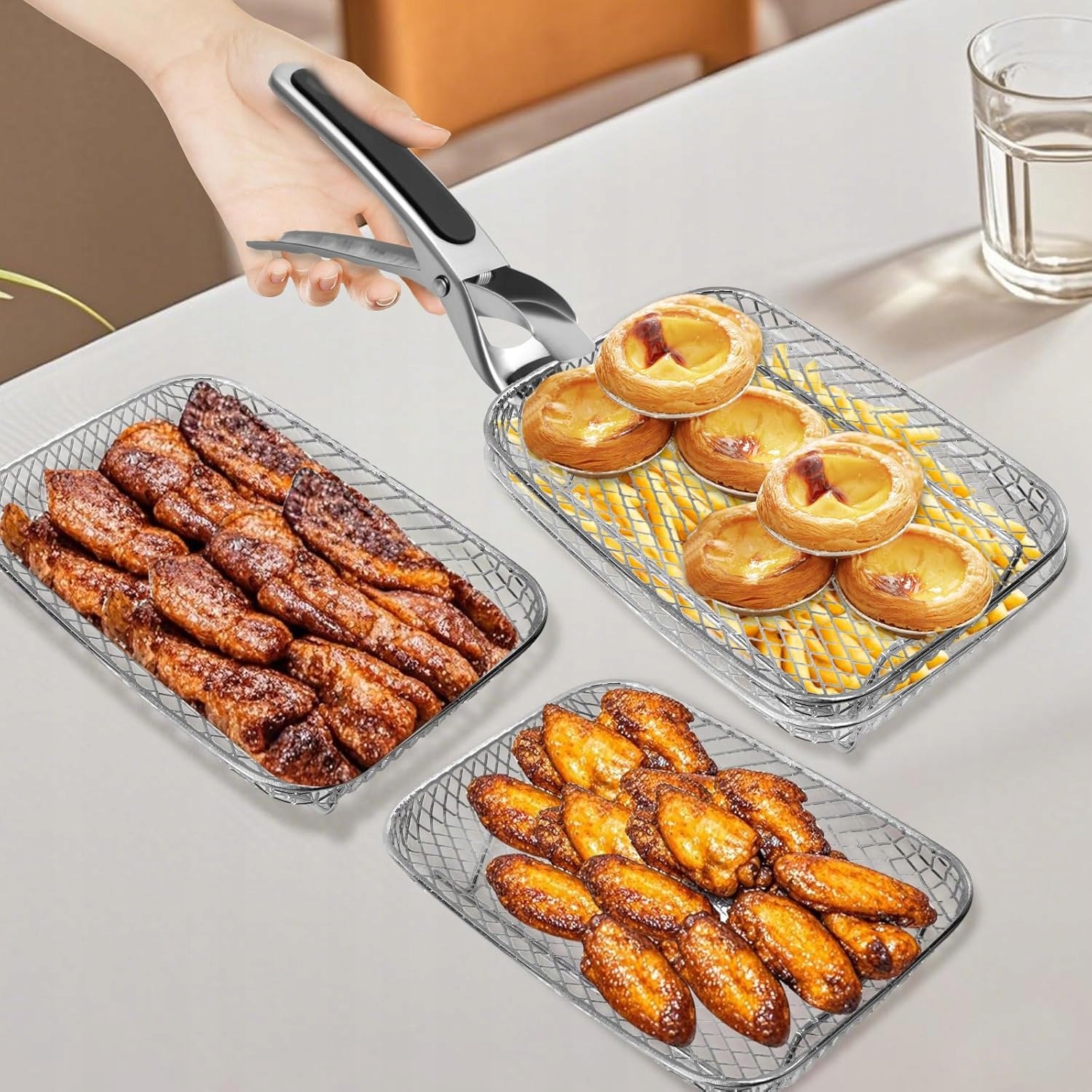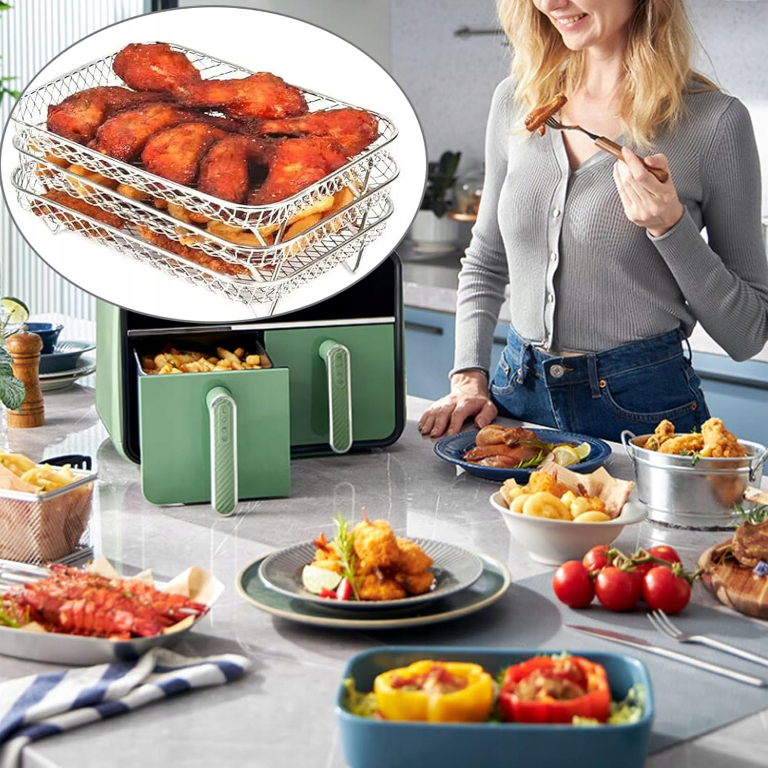 🔥🔥 Високоякісний харчовий матеріал: 3-ярусна стійка для аерофритюрниці виготовлена з високоякісної харчової нержавіючої сталі 304, яка є безпечною, нетоксичною та довговічною, запобігає утворенню іржі та корозії, спричиненій зовнішнім середовищем. Ідеальний аксесуар для вашої фритюрниці, щоб насолоджуватися здоровою їжею.