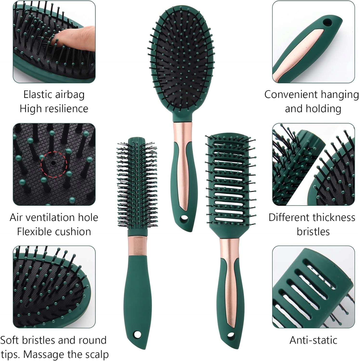 - Набір пензлів для волосся: Три зелені щітки для волосся містять овальну подушку безпеки, прямокутні порожні та циліндричні пензлики для волосся, які використовуються для розчісування красивих зачісок і швидкого висихання вологого волосся. Це практичні статті повсякденного побутового використання