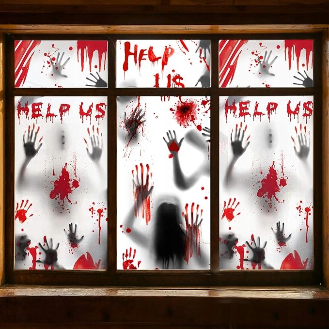 Набір містить 2 віконних аркуша (155 x 76 см) та 1 дверний постер (183 x 76 см) із реалістичними плямами крові, відбитками рук і словами «ДОПОМОЖІТЬ НАМ». Ідеально підходить для вечірок, прикраси дому, офісу чи вітрини.
