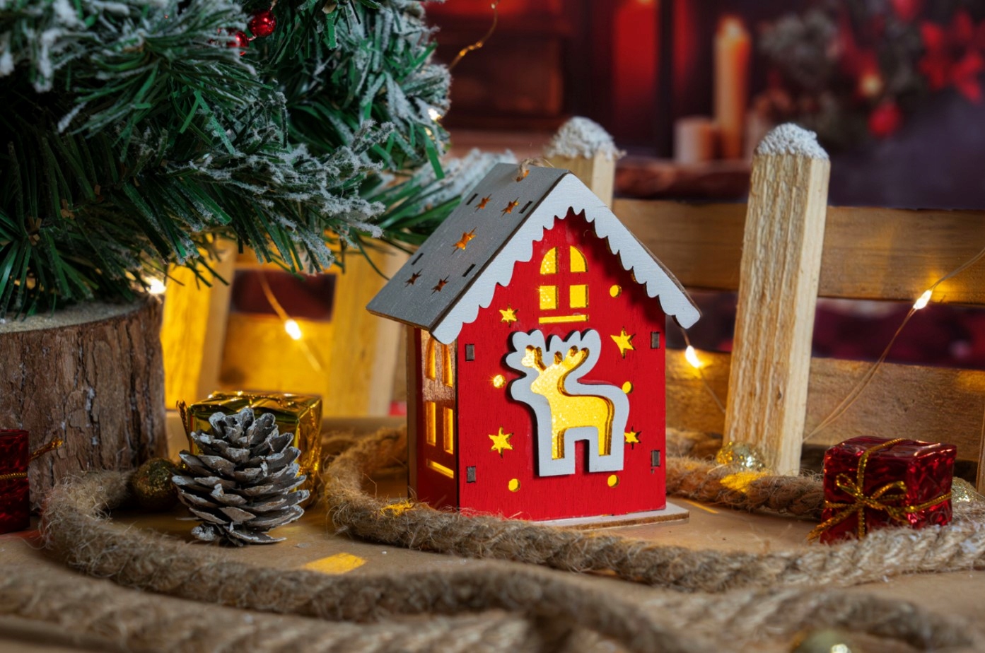 РІЗДВЯНИЙ БУДИНОК ДЕРЕВ'ЯНИЙ ЧЕРВОНИЙ ЛІХТАР Світлодіодний ліхтар з підсвічуванням