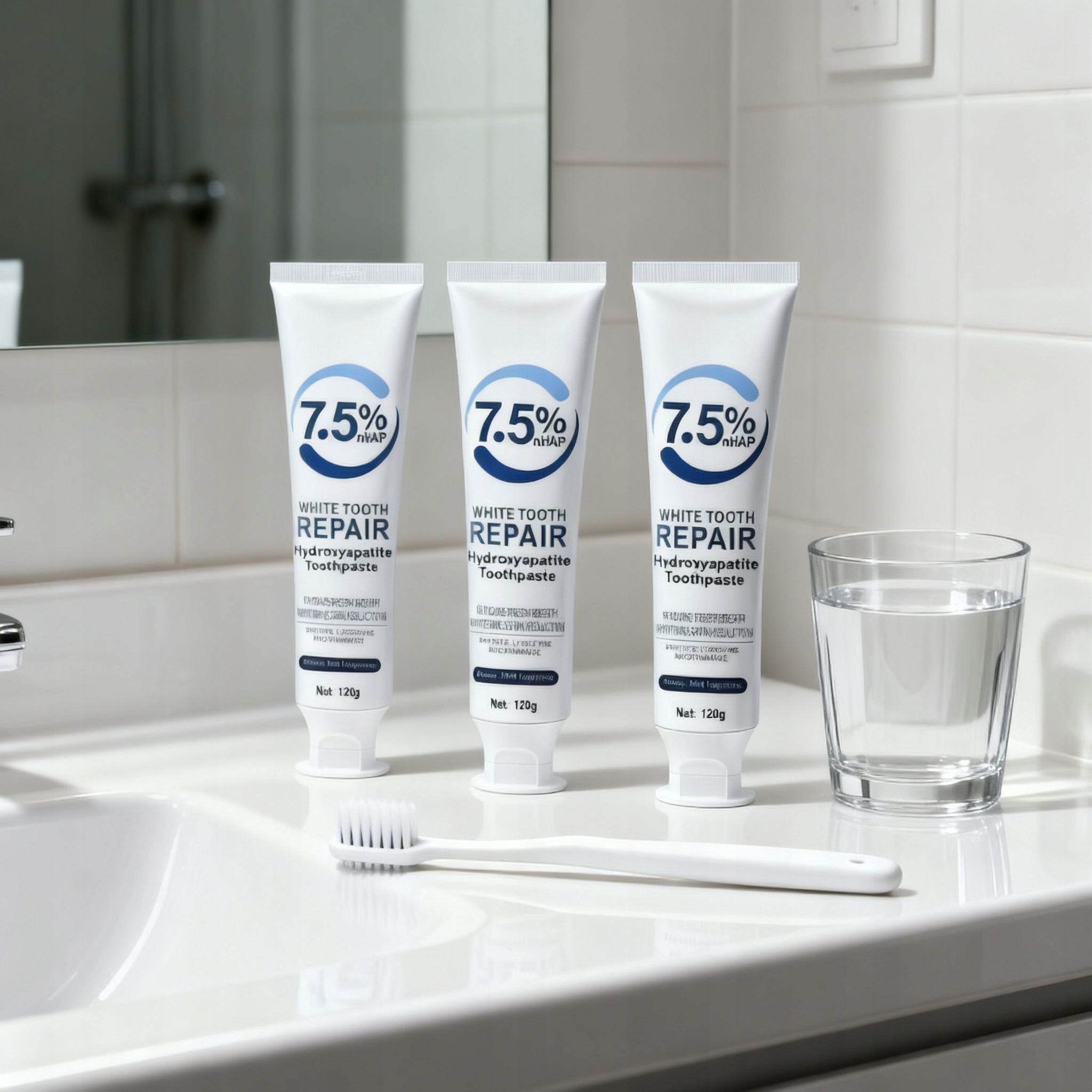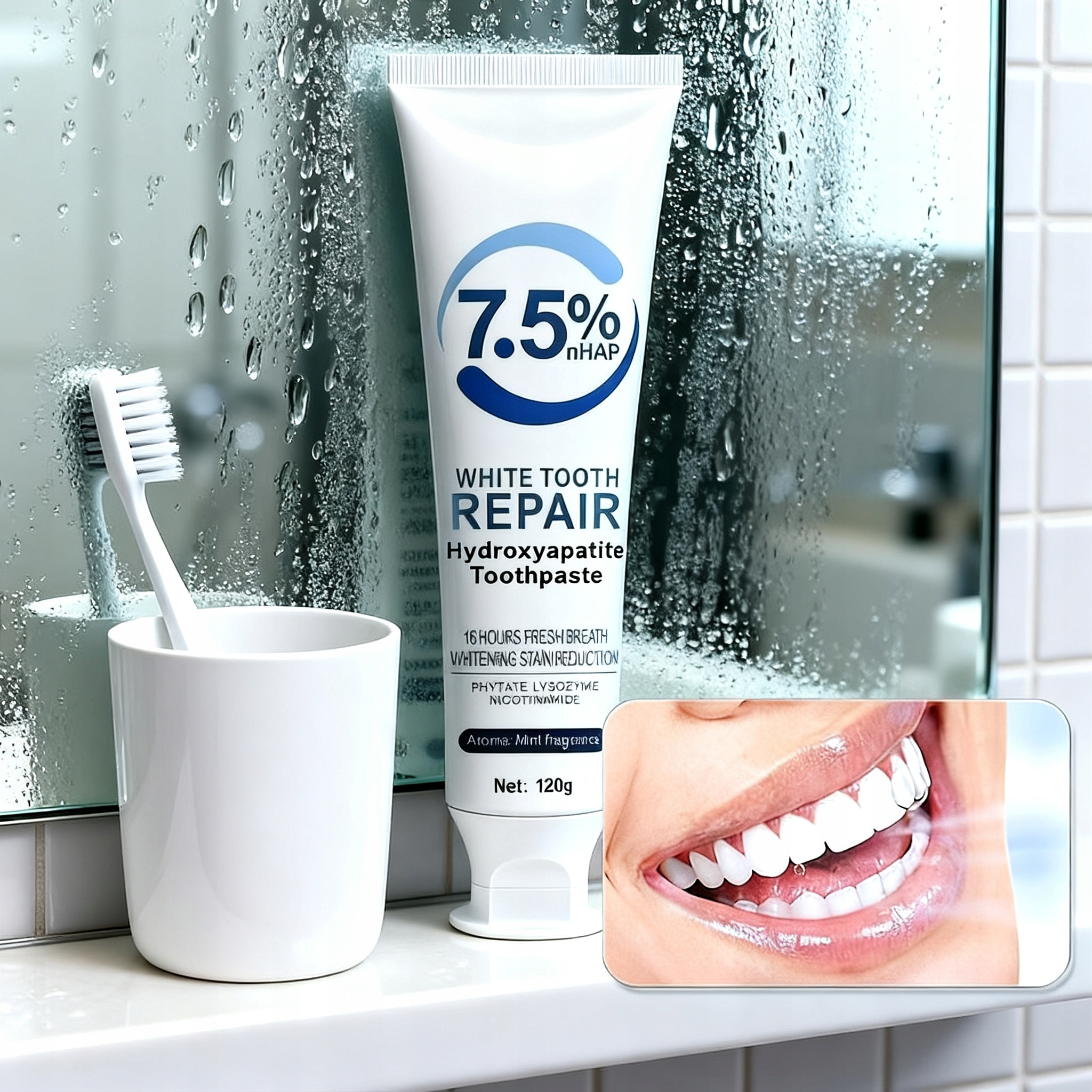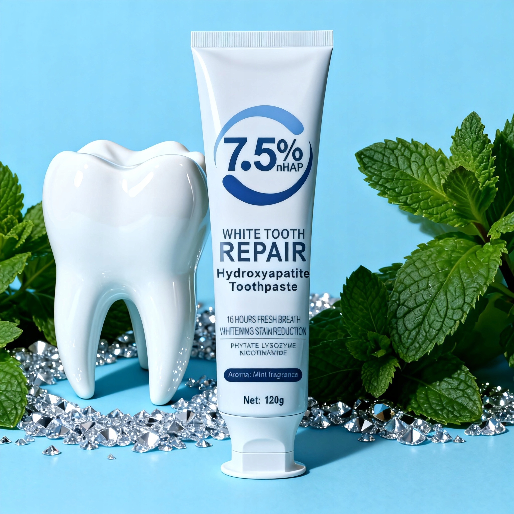 - 【Зубна паста з гідроксиапатитом на 7,5%】: на основі гідроксиапатиту, природного мінералу, який допомагає ефективно відновлювати та зміцнювати зубну емаль, захищаючи зуби від щоденного зношування.