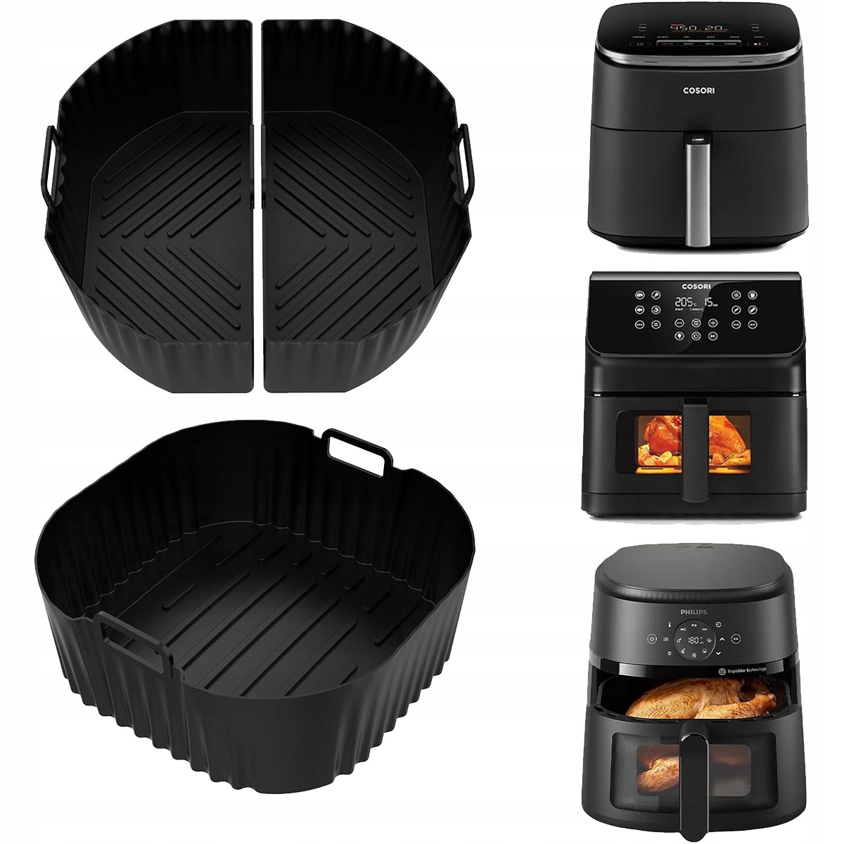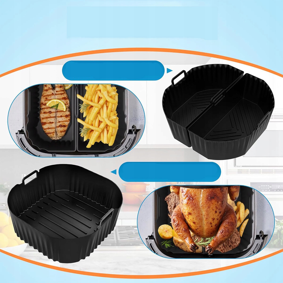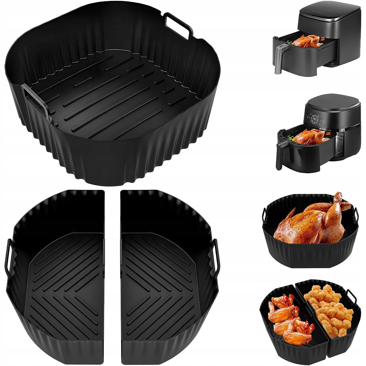 - силіконова форма для фритюрниці 2 в 1, дві окремі камери для приготування двох невеликих порцій одночасно, що запобігає змішуванню запахів і економить час і зусилля. Цільну силіконову форму можна використовувати для приготування великих порцій, наприклад, цілої курки.