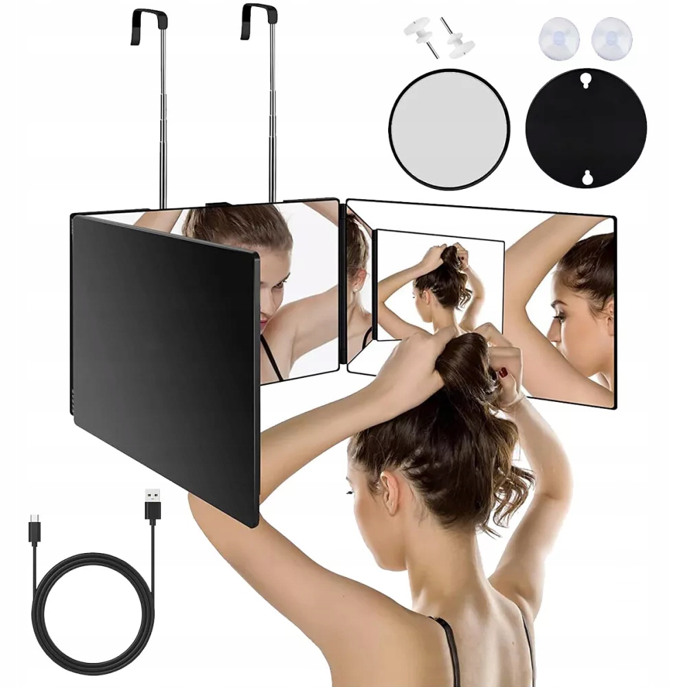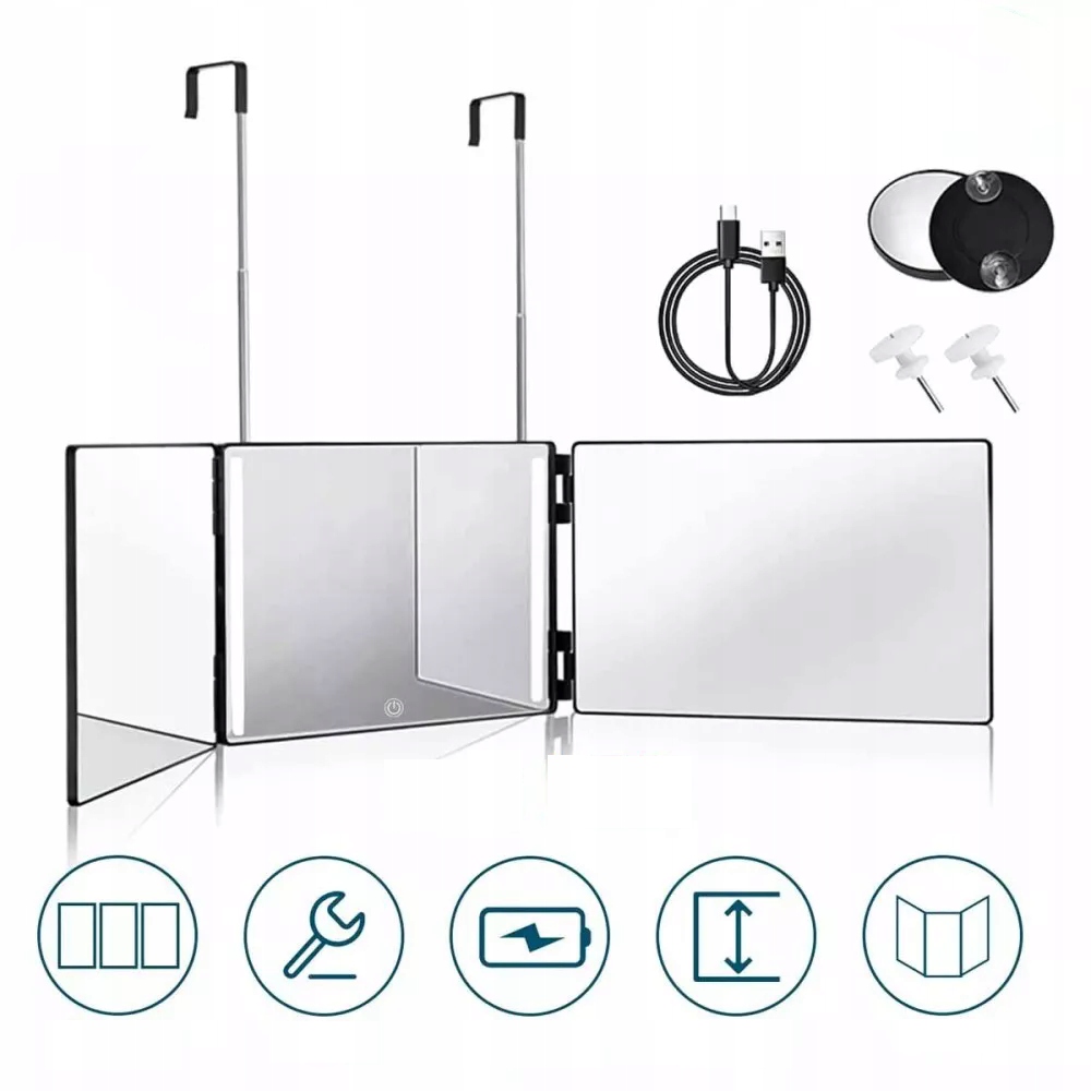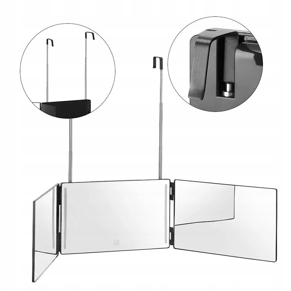 ДЗЕРКАЛО 360 З LED ПІДСВІЧУВАННЯМ ТА ТЕЛЕСКОПІЧНИМИ ГАЧКАМИ, 3-СТОРОННЕ ДЗЕРКАЛО ДЛЯ СТРИЖКИ