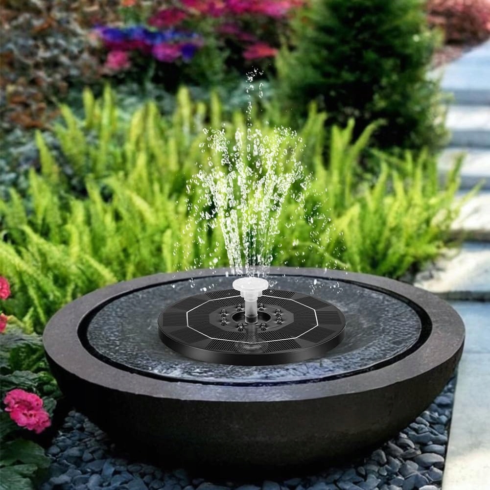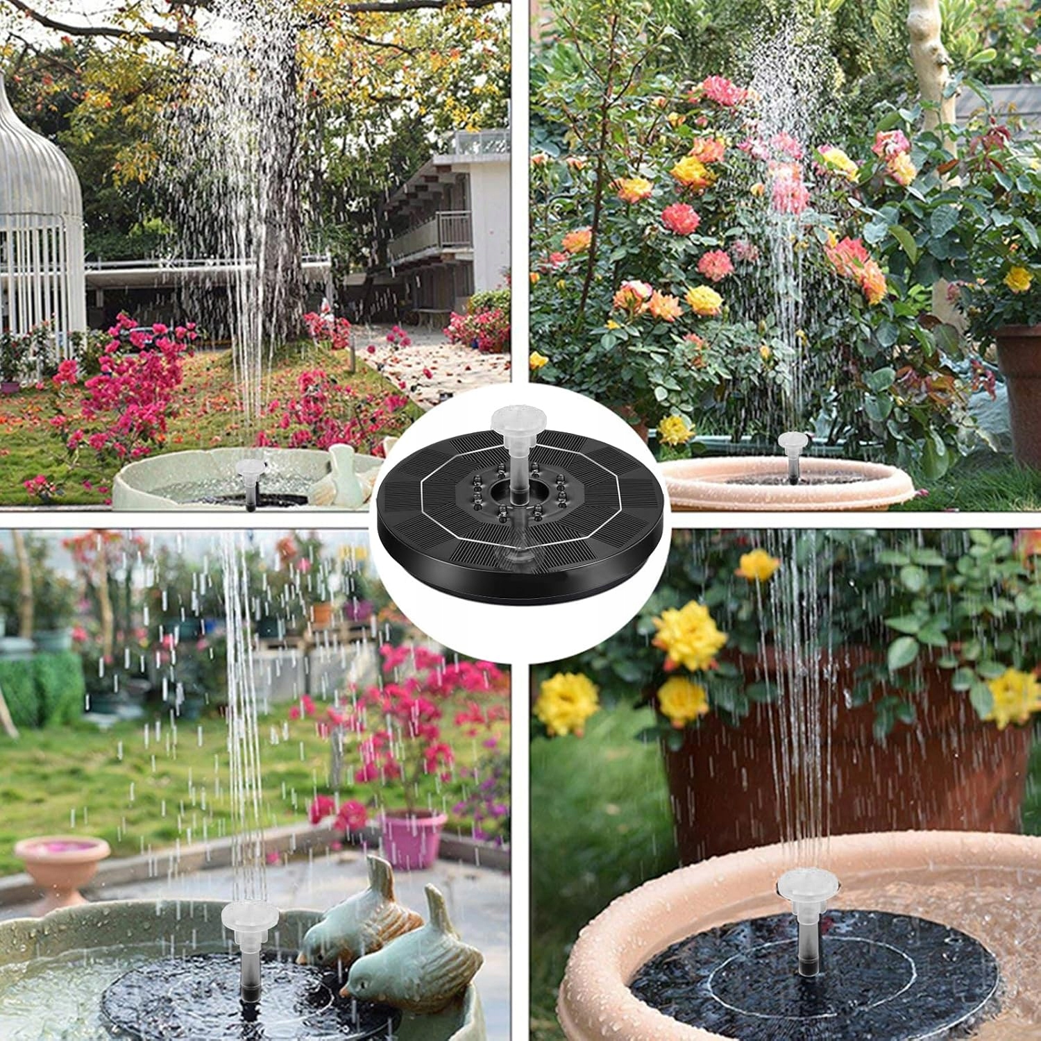 Сонячний фонтан оснащений 360 ° поворотною форсункою та 6 індивідуальними насадками, що дозволяє створювати різні ефекти фонтану. Сонячний фонтан оснащений присосною чашкою на дні, що дозволяє легко встановити сонячний фонтан посередині ставу і заважає йому ковзати та плескати.