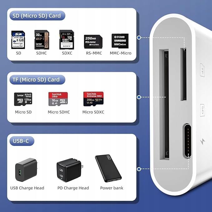 - Швидка швидкість передачі даних: зчитувач SD -карт на телефони надсилає фотографії або відео з камери або картки пам'яті на телефон або планшет зі швидкістю від 20 мб/с до 30 мб/с. Швидка швидкість передачі забезпечує швидку синхронізацію фотографій у форматі RAW, 4K фільмів та інших. Ця SD-карта підтримує стандартні формати фотографій, включаючи форматів відеороликів JPEG, RAW та 4K, включаючи H.264 та MPEG-4. Зчитувач SD -карт підтримує до 512 ГБ.