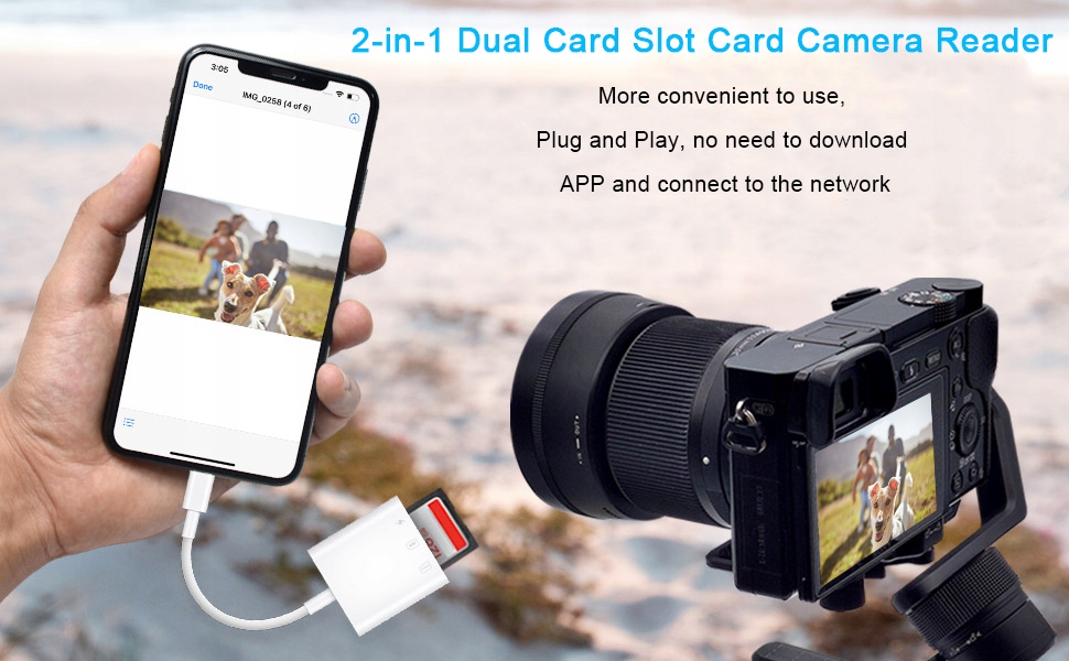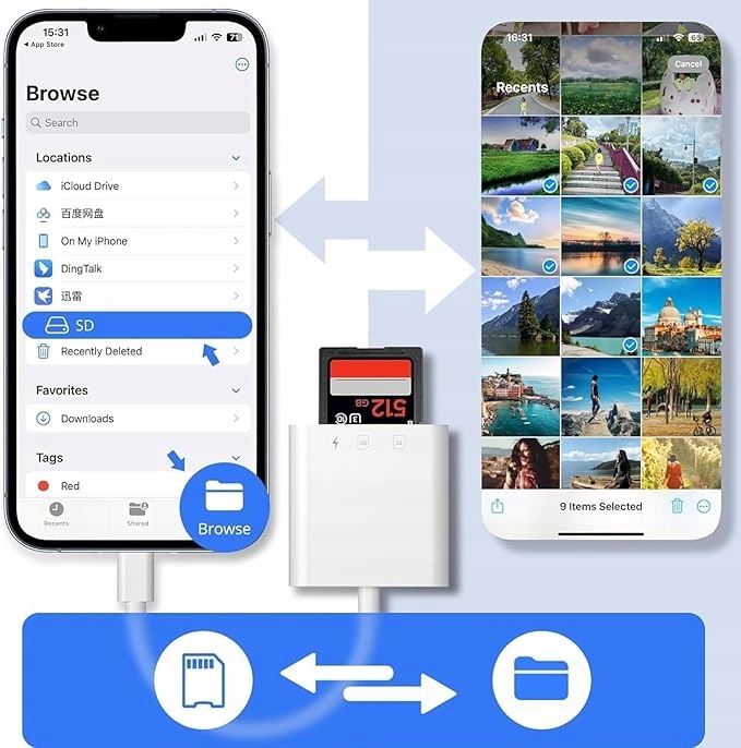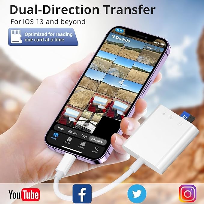 - Дво -шлях передача : у випадку систем iOS 13 та новіший зчитувач SD -карт підтримує двоповерхову передачу. Підключіться та відтворюйте, додатки не потрібно. Адаптер SD -карт для телефонів не вимагає застосування інших компаній, використовує вбудовані файли додатків в iOS та підтримує відтворення відео.