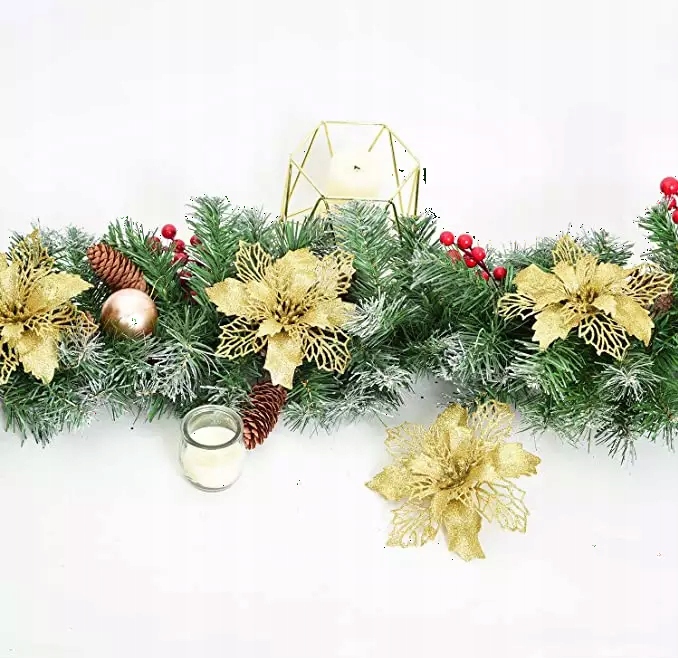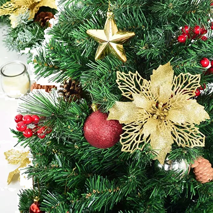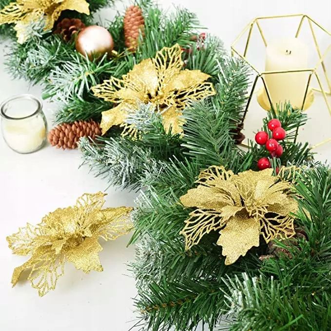 Різдвяні квіти виготовлені з гнучкого пластику та прикрашені блискітками.