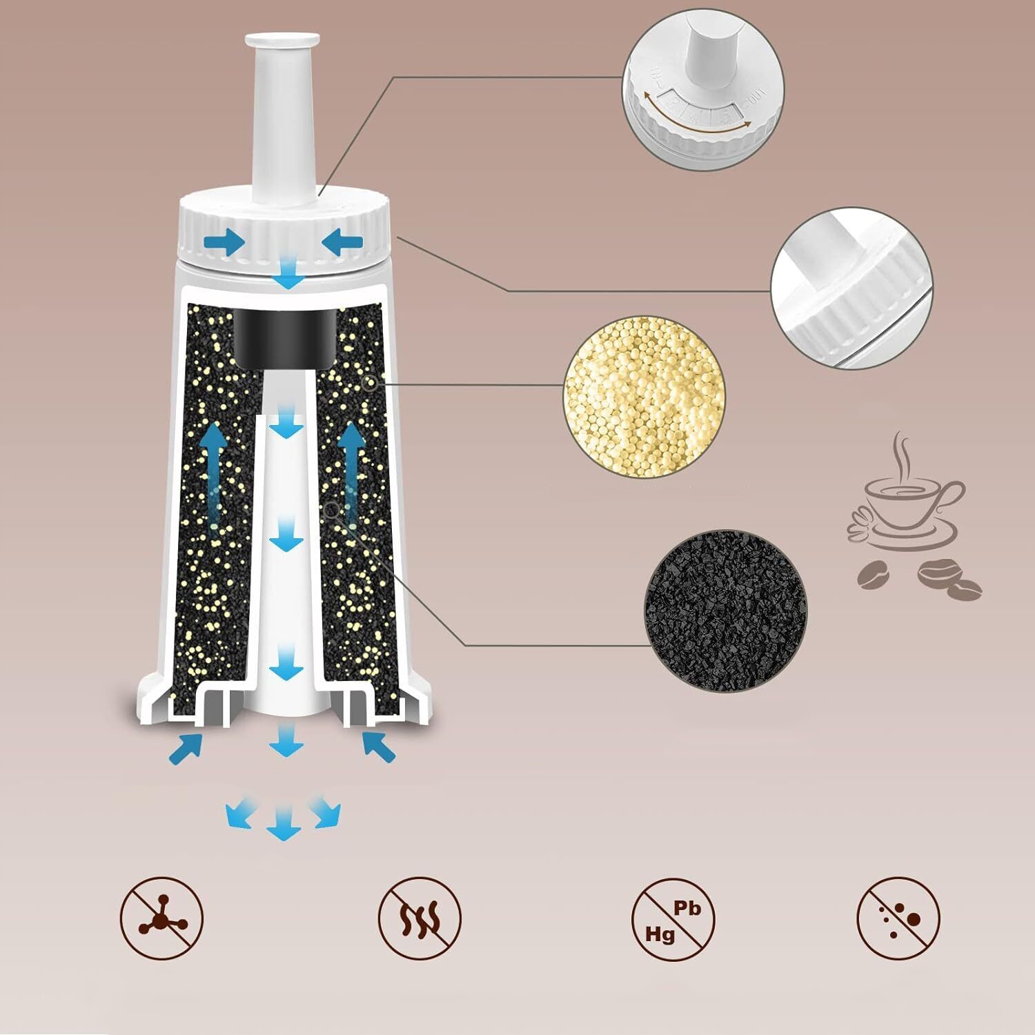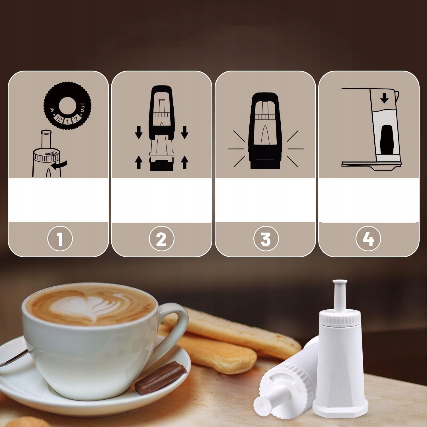 Картридж фільтра для води для кавомашин адсорбує відкладення з водопровідної води. Запобігає утворенню мінеральних відкладень, розчинених органічних речовин, надлишку мінералів, важких металів та інших шкідливих домішок, запобігає утворенню накипу в трубах всередині кавомашини.