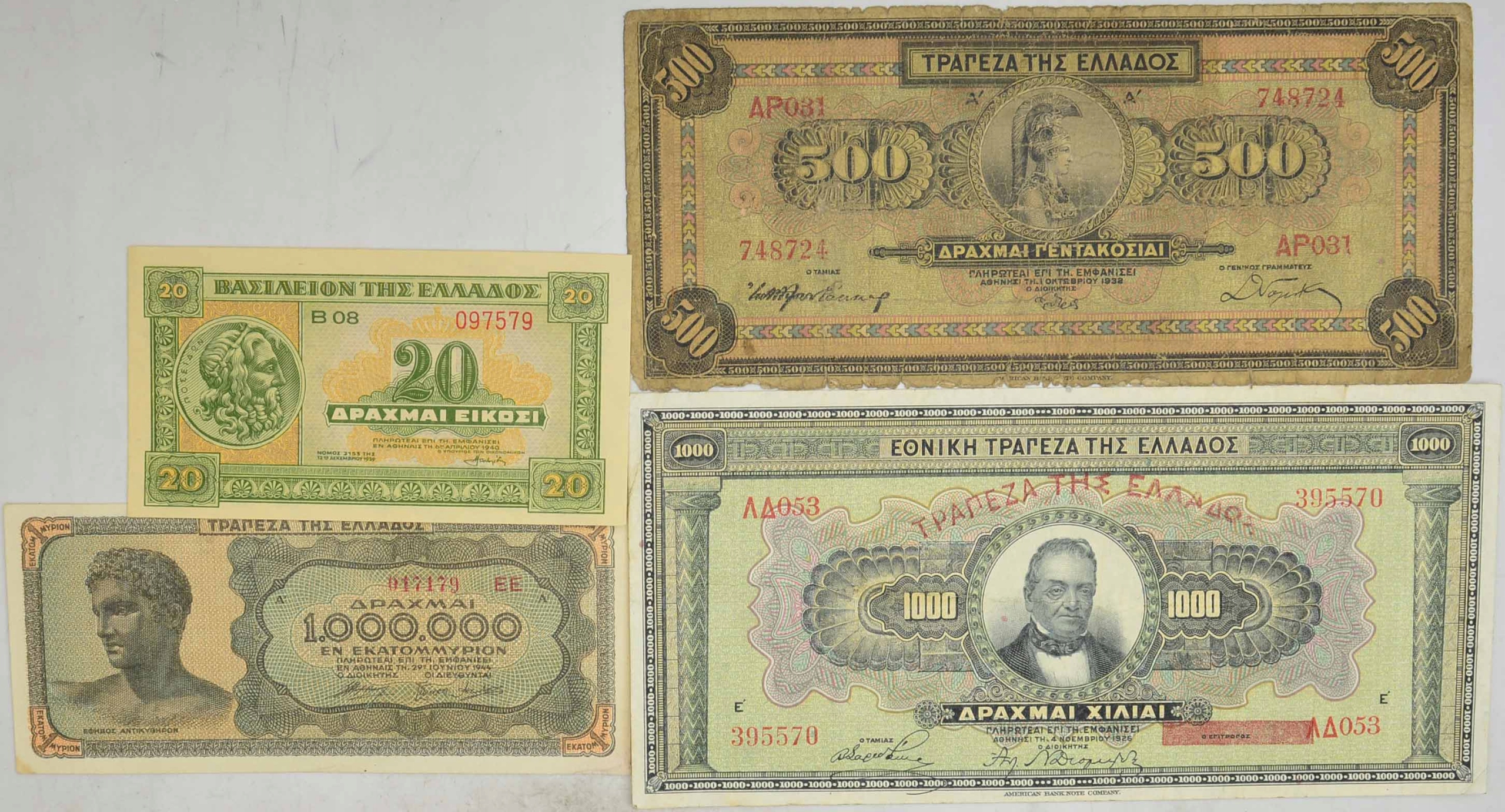 - Опис: У набір входять банкноти номіналом: 20 драхм 1940 (St.1/1-), 500 драхм 1932 (St.4+), 1000 драхм 1926 (1928) (St.3+), 1 мільйон драхм 1944 (St. .3+)