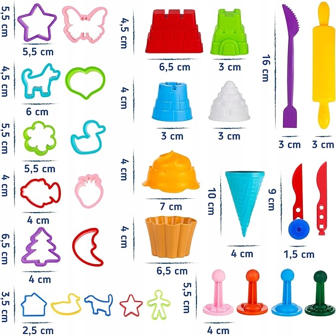 Великий набір з 30 форм та аксесуарів - ідеальний вибір для творчої гри з кінетичним піском, пластичином або тортом. Різні форми та інструменти заохочують дітей розвивати уяву та ручні здібності.