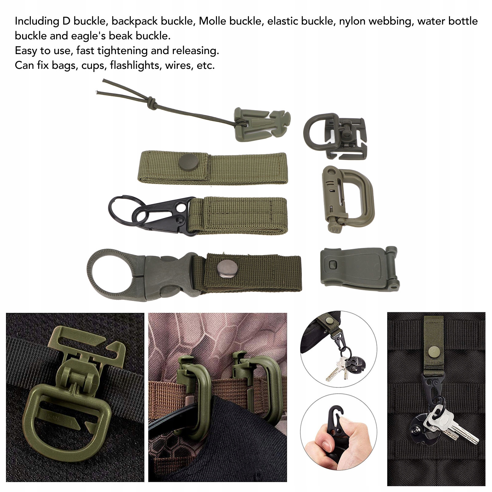 1. 30 штук: Набір аксесуарів Molle включає 8 -D пряжку, 8 рюкзаків, 4 пряжки молле, 4 гнучкі пряжки, 2 нейлонові стрічки, 2 пряжки з водою та 2 затискачі з гачком у формі ори, що може задовольнити різні потреби.