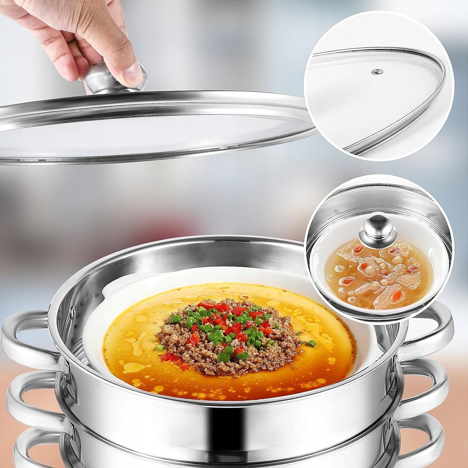 30 СМ 5-ШАРОВА КУХОННА ПАРОВАРКА З НЕРЖАВІЮЧОЇ СТАЛІ ЗІ СКЛЯНОЮ КРИШКОЮ