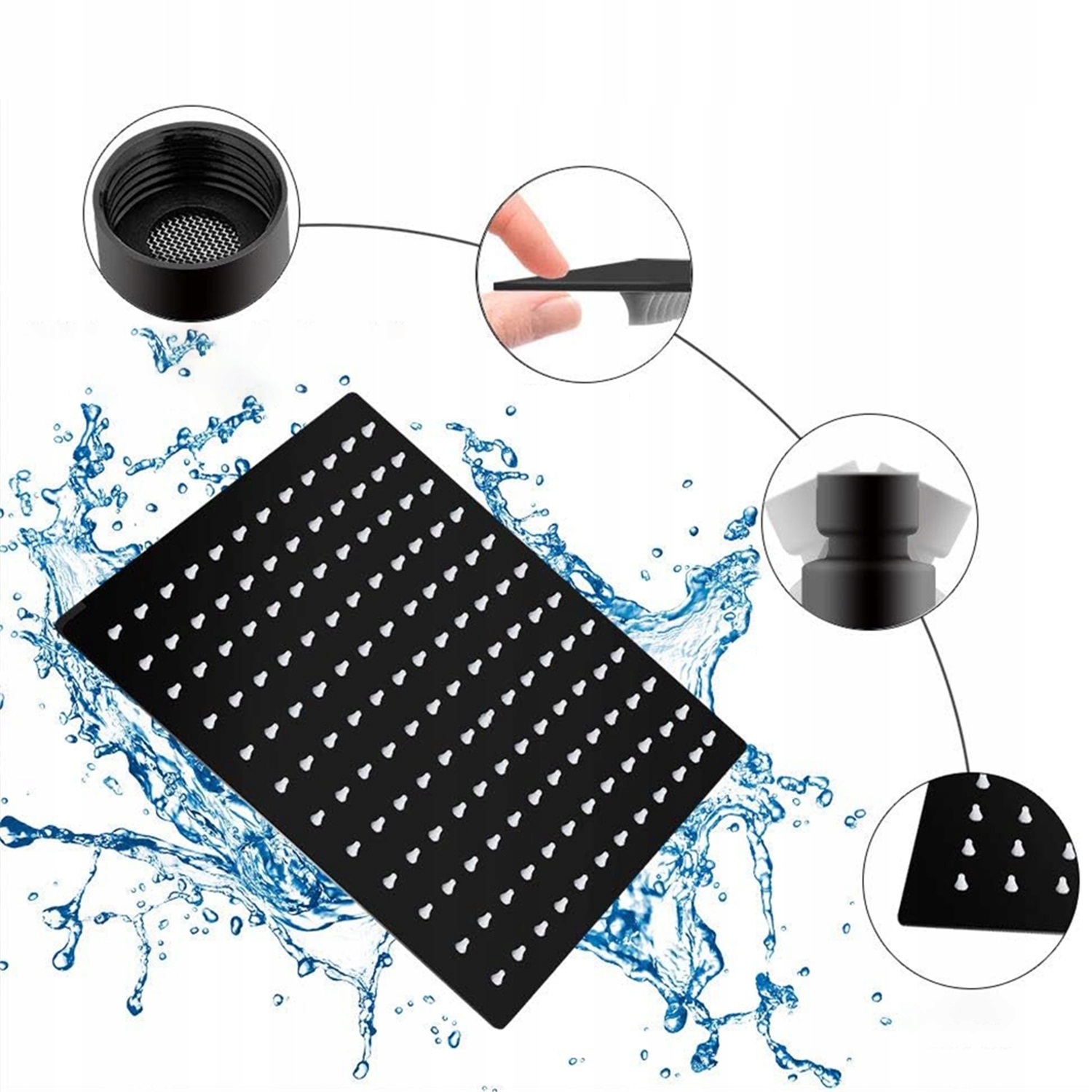 - Товщина лише 2 мм, ультратонкий дизайн. Виготовлений повністю з нержавіючої сталі 304. 144 форсунки забезпечують більш розкішний душ і загальний більш сучасний вигляд.