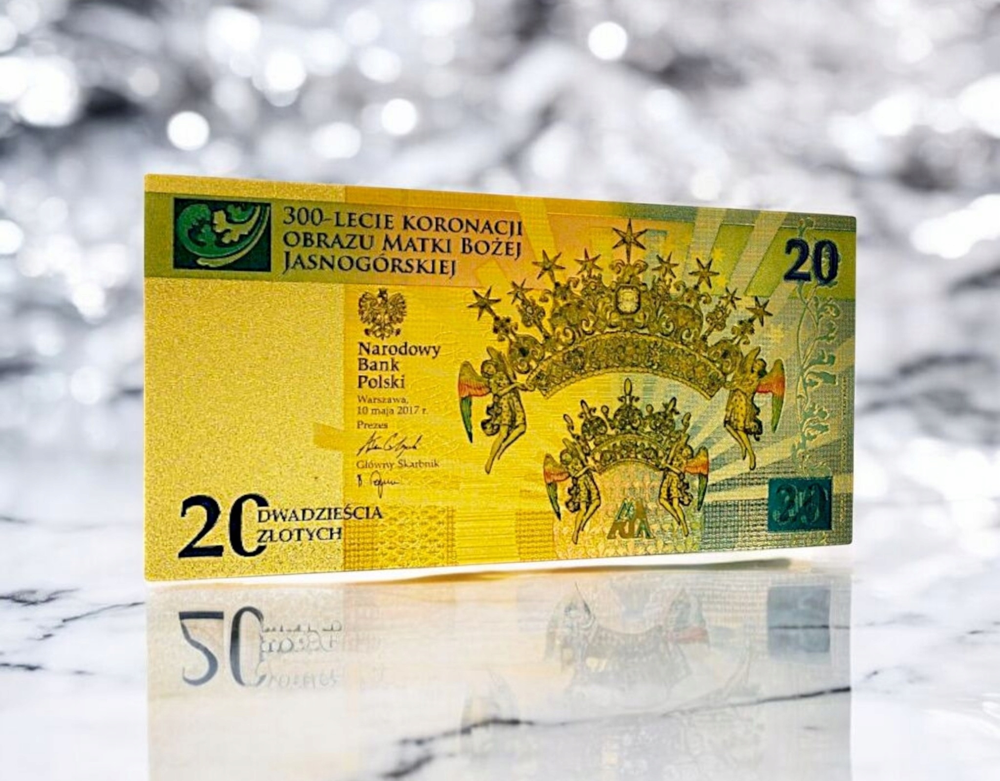 ⚜️Унікальна колекційна банкнота номіналом 20 злотих, виготовлена з високоякісного ПВХ та покрита елегантною золотою фольгою, випущена до 300-річчя коронації образу Матері Божої Ясногірської – Королеви Польщі.