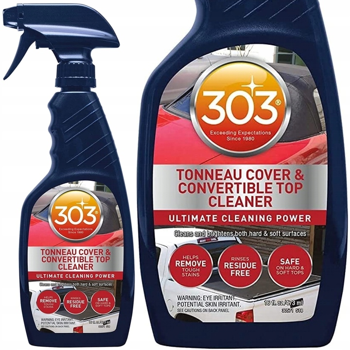 303 Конвертований верхній очищувач - рідина, призначена для очищення та фарбування м'яких дахів кабріо, очищення та очищення рідини. Ідеально очищає як вінілові, так і матеріальні поверхні. Завдяки колоїдним властивостям він видаляє найважчий бруд з матеріалу. Безпечний для всіх видів матеріалів, з яких використовуються м'які кабріолеті. Крім того, він ідеально підходить для очищення оббивки автомобілів. 303 Convertible Top Cleare нетосичний і нефламований.