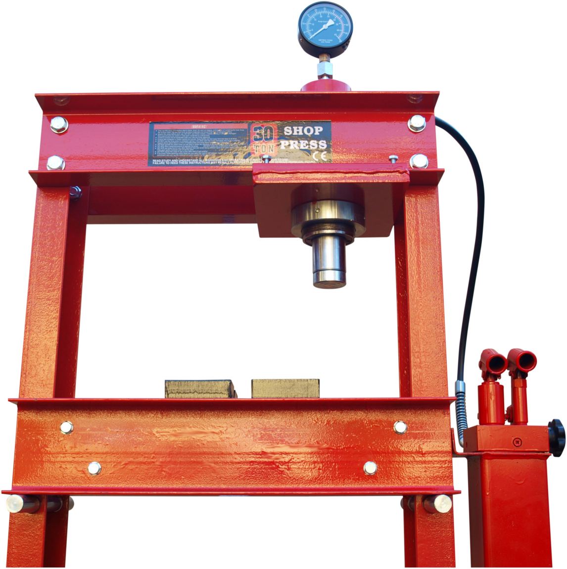 Використовуючи прикріплений важіль, ви можете отримати тиск до 30 тонн, що точно контролюється манометром. Двоступінчастий насос забезпечує швидше просування поршня та повільніше й точніше.