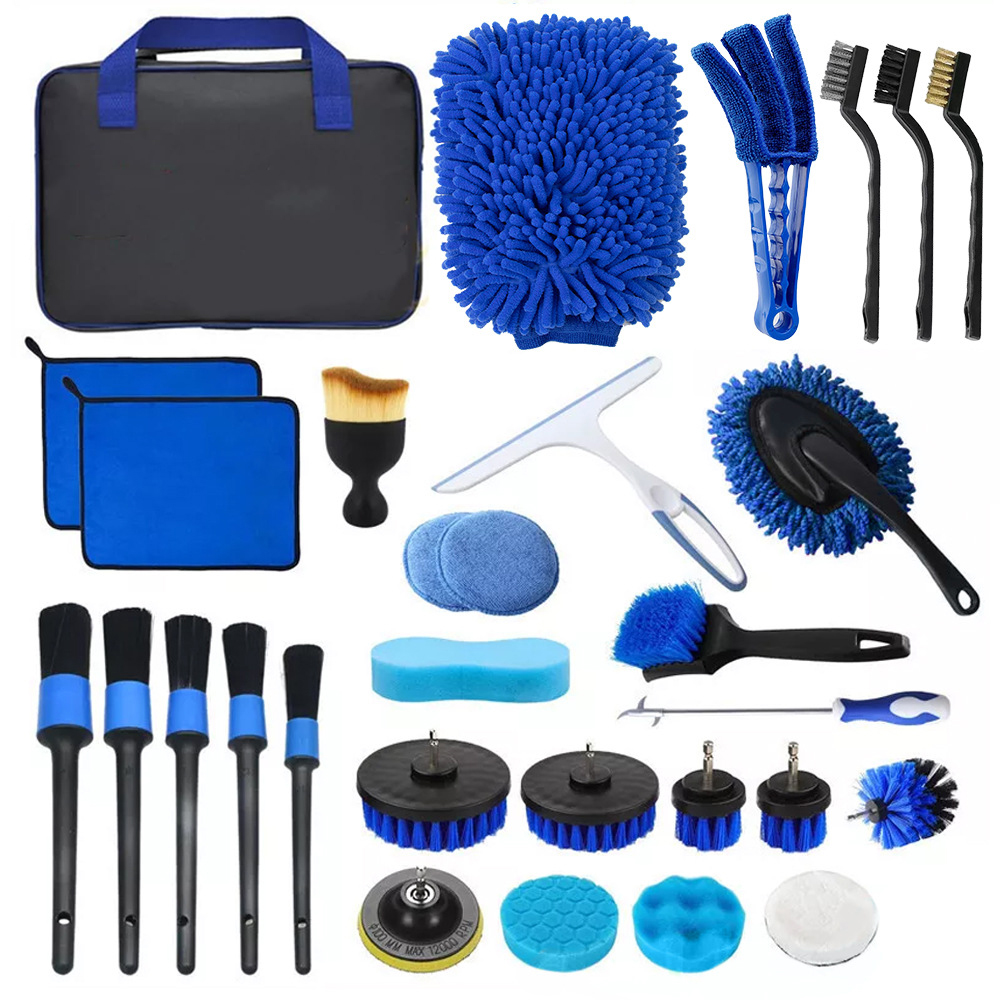 【Ідеальний набір щіток для деталізації】 30 наборів для деталізації автомобіля, включаючи 1 рукавичку для автомийки, 1 синьо-чорну щітку для шин, 1 D-подібний автомобільний склоочисник, 5 щіток для очищення вентиляційних отворів кондиціонера, 3 маленькі чорні щітки для плити, 1 стиснуту губку, 5 3-дюймових полірувальних губок для електричних щіток, 1 щітка для автомобіля, 1 щітка для чищення автомобіля, 3 насадки для електричної щітки (2 дюйми, 4 дюйми, 5 дюймів), 2 синіх рушники та 1 синя сумка для транспортування.