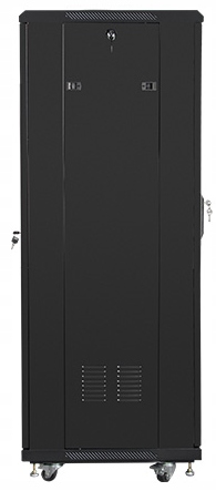 Шафа дозволяє повністю регулювати глибину вертикальних монтажних рейок. з вхідними дверцятами із загартованого скла з замком, який монтується як з правого, так і з лівого боку. Він має знімні бічні панелі (з замками в комплекті) і задні міцні сталеві двері з замком. Можливість введення кабелю через закриту верхню та нижню панелі (з розетками в комплекті).