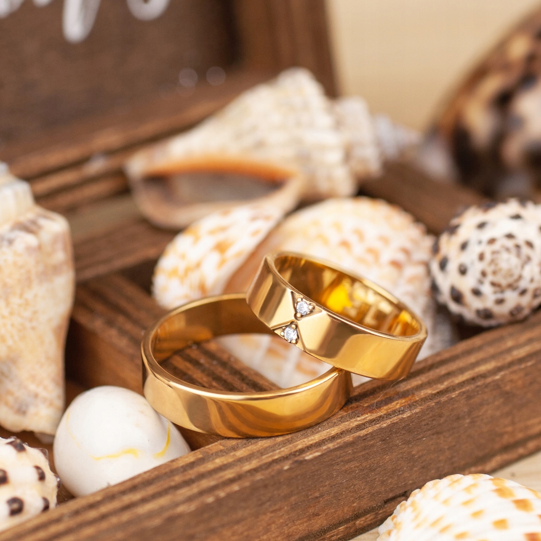 Мінімалістичний сучасний набір золотих обручок із плоским профілем. Обидві обручки мають однакову форму декору, але представлені в різній формі. Малюнок на чоловічій обручці - це дві пересічні лінії, вирізані алмазною фрезою. Однак на жіночій обручці вирізи створюють дві трикутні виїмки, всередину яких вкладено каміння - циркони або діаманти на вибір.