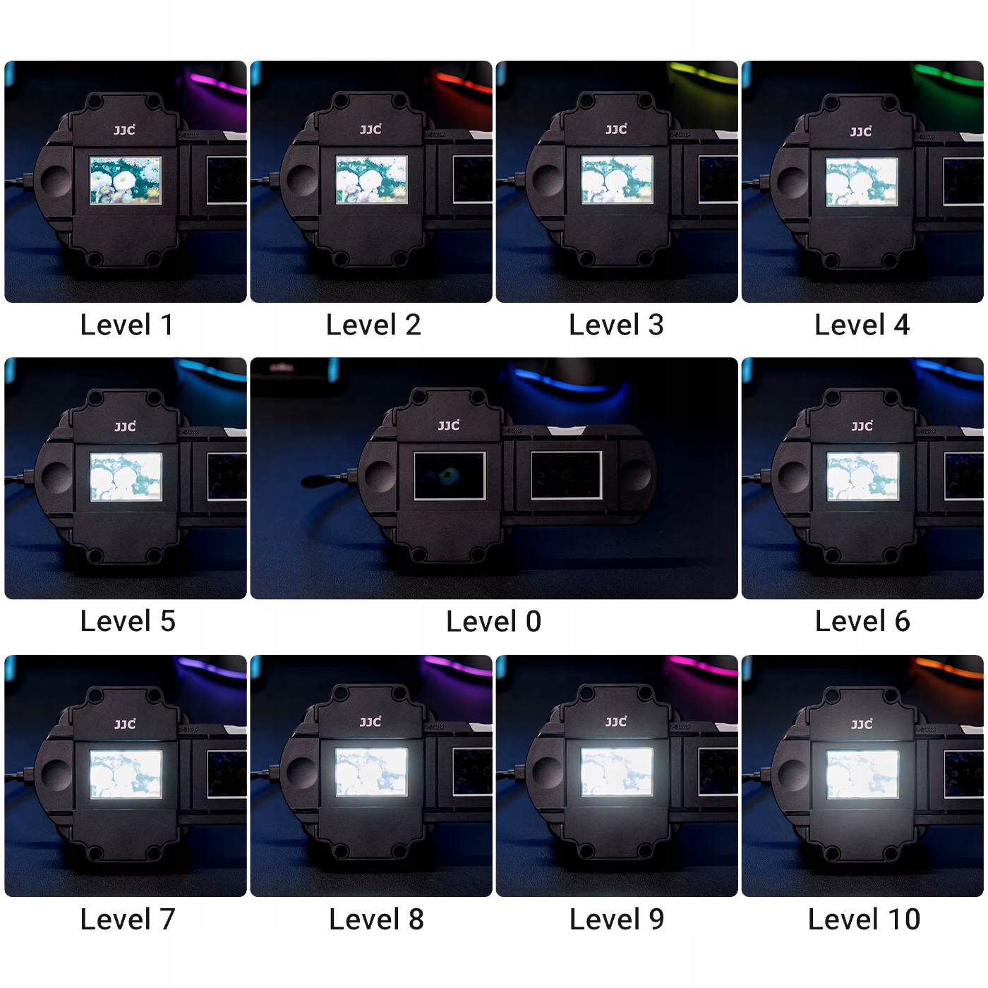 - Регулювання яскравості: яскравість регулюється за допомогою пульта дистанційного керування, розташованого на з’єднувальному кабелі. Доступно 10 рівнів яскравості, що дозволяє точно регулювати експозицію для конкретного негативу.