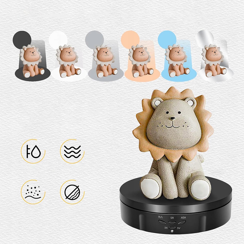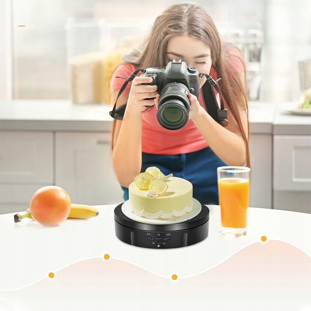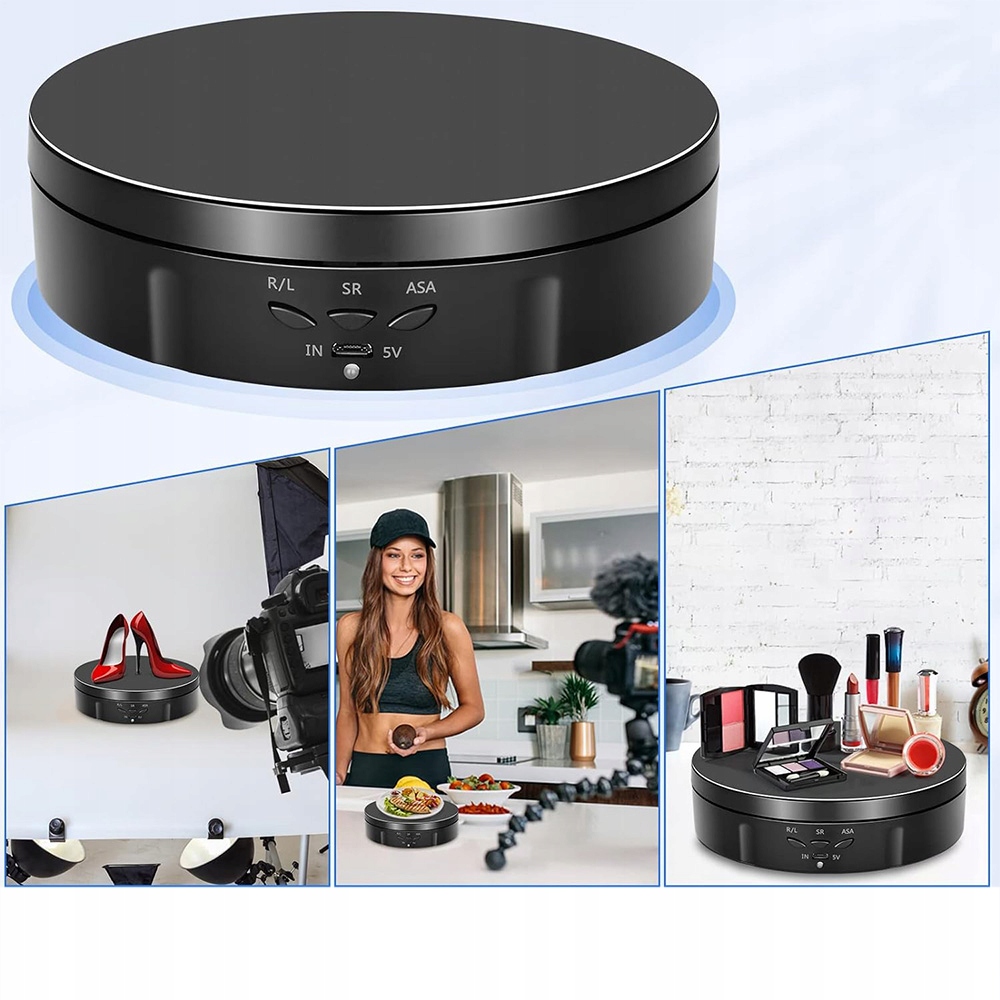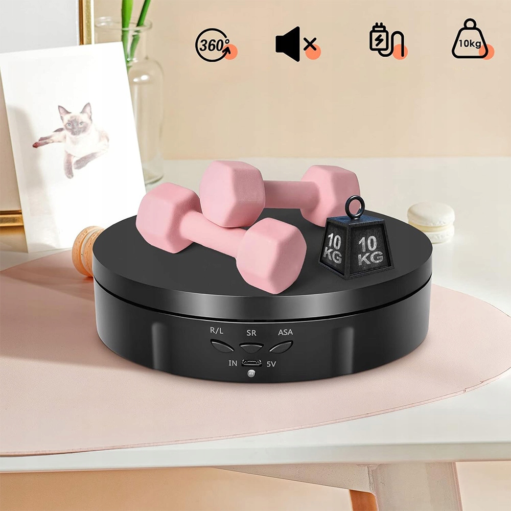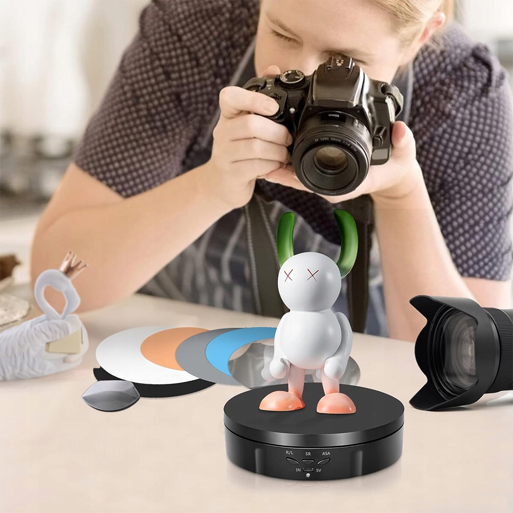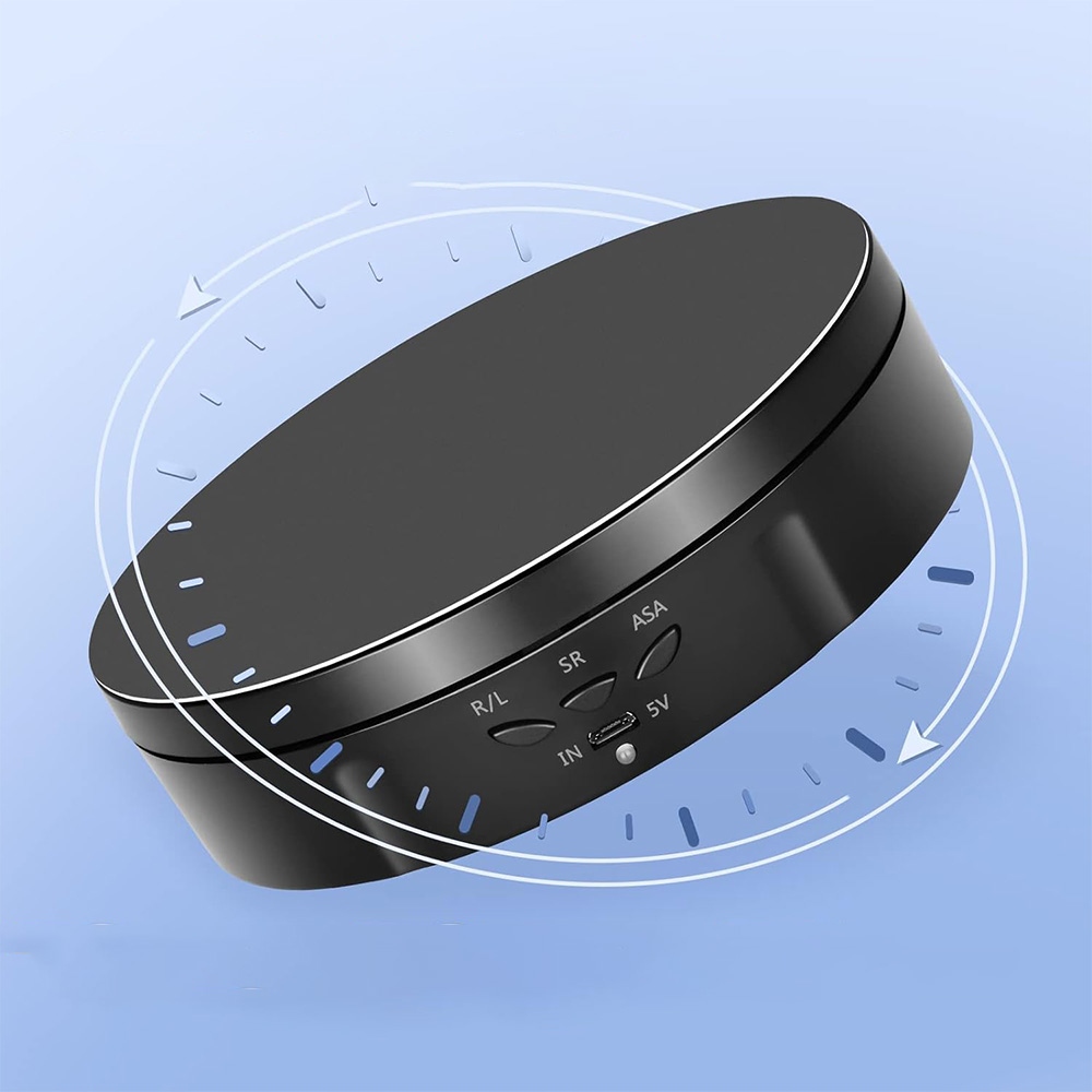 Електричний поворотний таблиця з акумулятором, який забезпечує робочий час 8 годин. Його можна перемістити вільно і його легко переносити та використовувати. Він має поворотну таблицю 360 ° та діапазон швидкості від 8 до 30 секунд за обертання. Ротаційна платформа може обертатися відповідно до руху за годинниковою стрілкою та за годинниковою стрілкою.