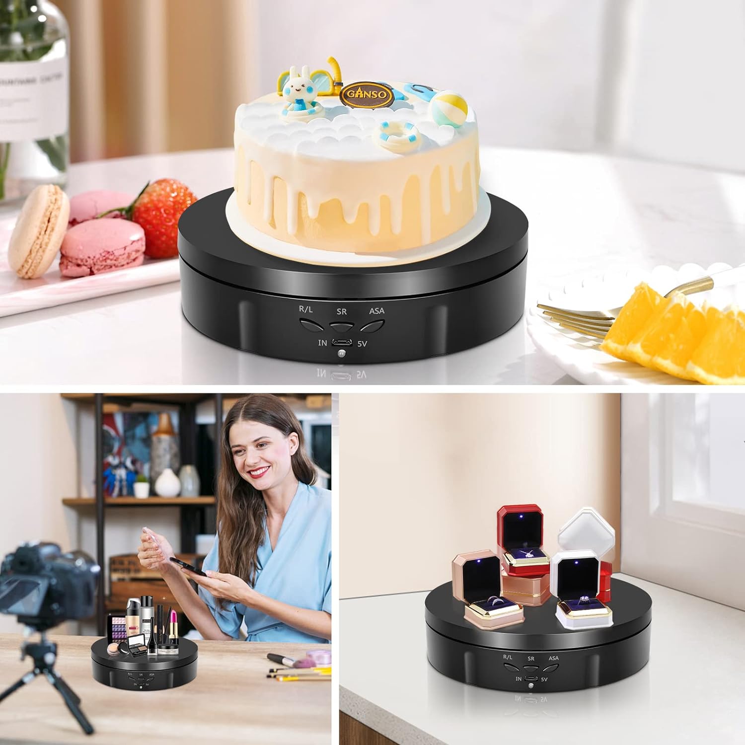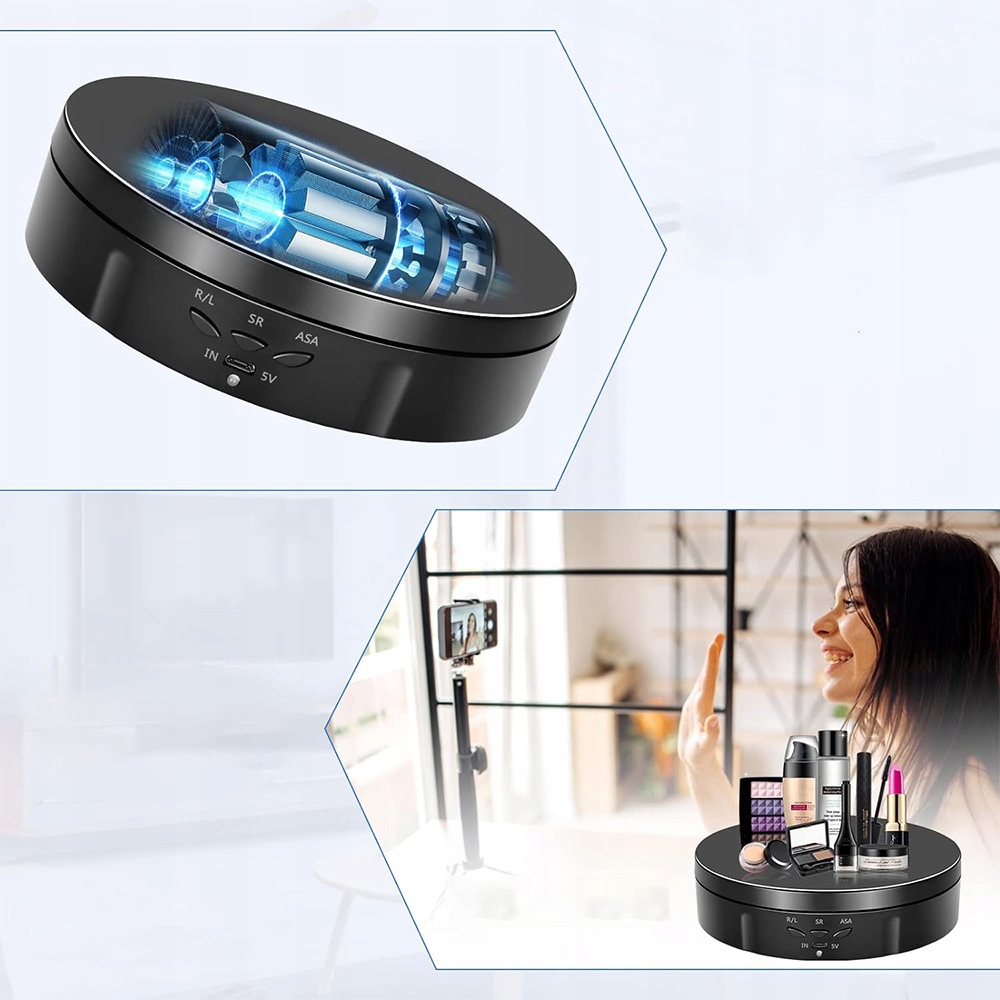 Діаметр поворотної кронштейна становить 14,6 см, а максимальне навантаження може досягати 10 кг. Електричний поворотній таблицю можна використовувати лише для відображення світла та невеликих предметів. Обертовий виставковий стіл часто використовується для чашок, косметики, статуетки та прикрас. Зовнішній вигляд модний і красивий, а барвистий фон може відображатися різними продуктами.