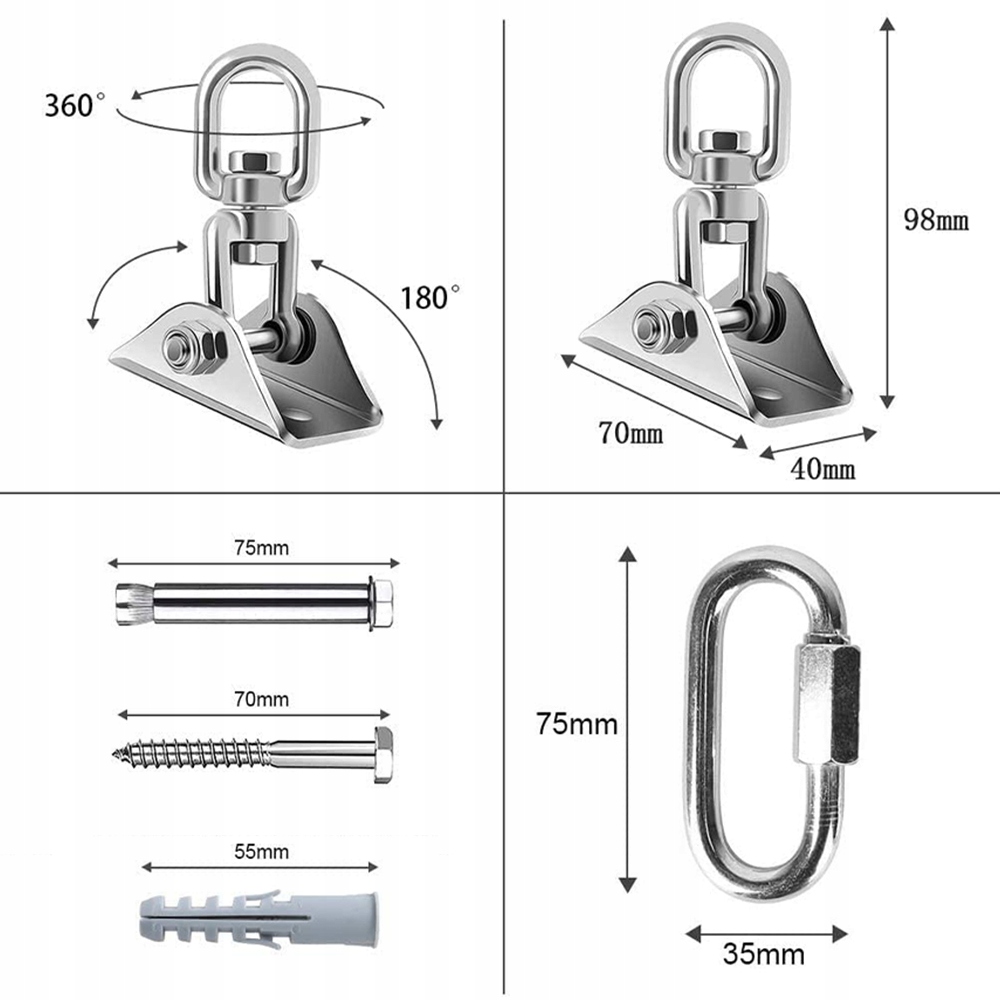 - Виготовлені з високої якості 304 нержавіючої сталі, вона міцна і міцна, стійка до зносу та корозії, а також забезпечує надійну ударну подушку. Гачок може бути обертається на 360 градусів, підходить для дітей та дорослих. Інші.