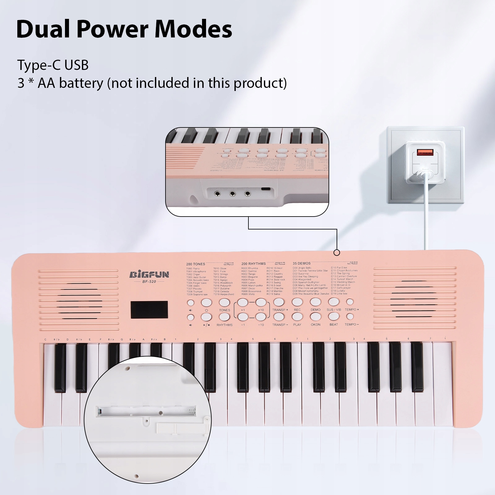 - 【Подвійні режими живлення】: Ця портативна клавіатура аранжувальника пропонує подвійні режими живлення - живлення акумулятора або джерело живлення (3*AA батареї, не включені). Ця гнучкість дозволяє грати на клавіатурі де завгодно, у будь -який час, не турбуючись про джерело живлення.