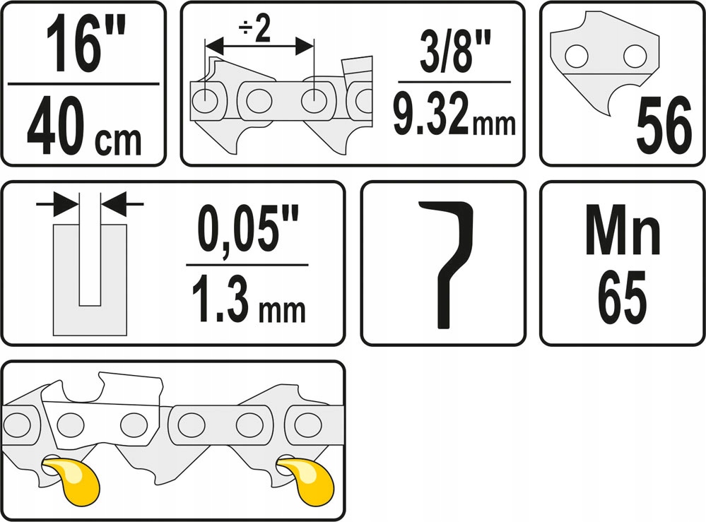 Довжина 16", 56 ланок, крок 3/8", ширина 0,05" (1,3 мм).