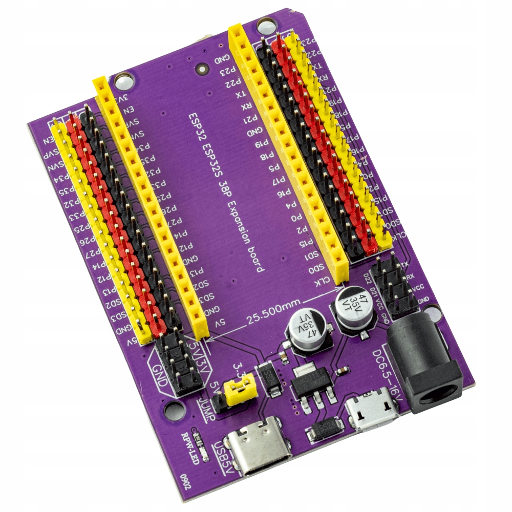 ми представляємо 38 -pin адаптер для плиток ESP32 - універсальний модуль, що розширює популярні модулі ESP32. Це дозволяє зручно використовувати плитку у своїх прототипах без необхідності підключення посібника з постачання. USB -порти використовуються лише для живлення, неможливо програмувати з їх використанням.