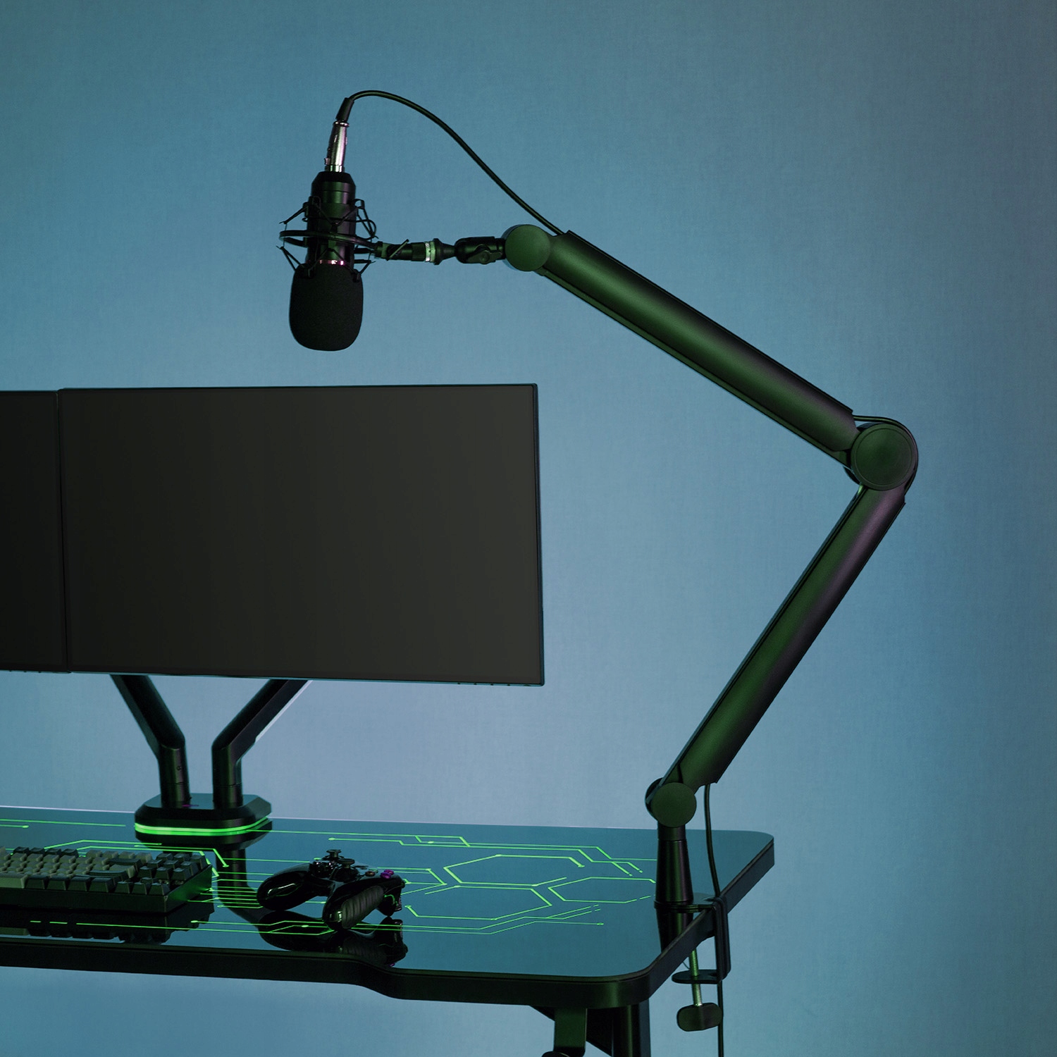 Ручка дозволяє прикріпити до краю столу та в отворі для проводів. Завдяки універсальним потоком 3/8 "та 5/8, ручка сумісна з більшістю студійних мікрофонів, доступних на ринку. Інтегрована система управління кабельами забезпечує порядок та збільшує естетику.