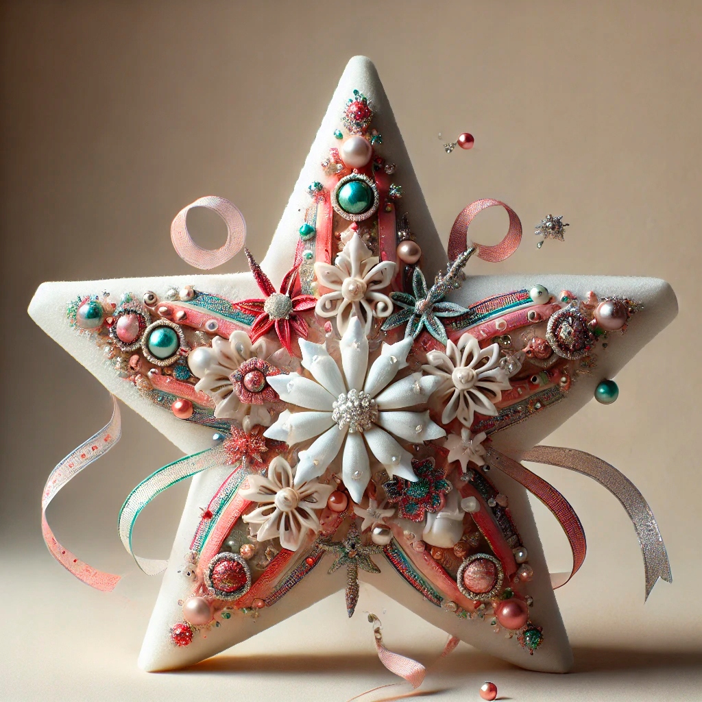 Зірка унікально прикрашена барвистими стрічками, блиском, намистинами та невеликими пофарбованими візерунками, створюючи жвавий і творчий вигляд.