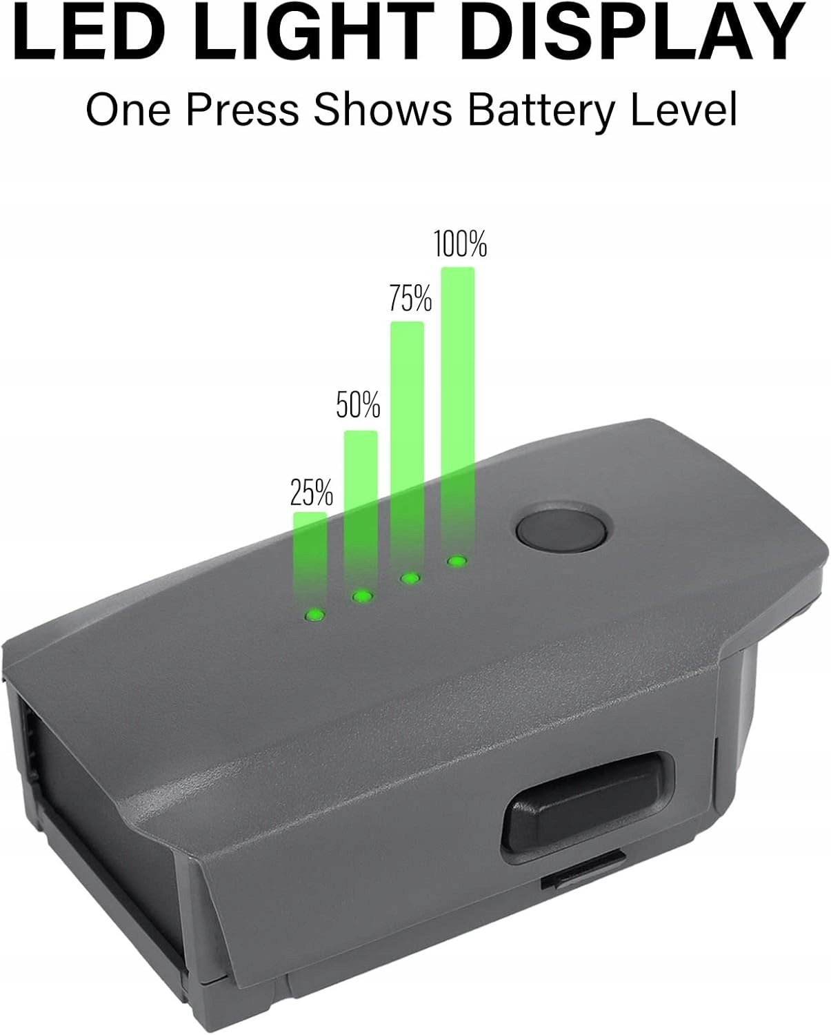 Висока ємність - 3830 мАг 11,4 В Mavic Pro Smart Flight Atatery. Кожен повністю заряджений акумулятор може тривати до 27 хвилин, щоб захопити вражаючі погляди або найпростіші життєві задоволення. Фактичний час може змінюватися залежно від інших факторів, таких як висота, вітер, температура, модель польоту тощо. Чотири побудовані світлодіодні індикатори показують живлення в режимі реального часу після натискання кнопки.