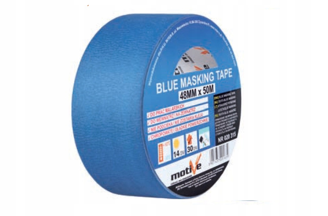 Синя малярська стрічка. Професійна малярська стрічка з підвищеними властивостями захисту поверхні. Використовується для захисту під час малярних і ремонтних робіт. На відміну від інших малярних стрічок, він захищає внутрішні поверхні до 30 днів і зовнішні поверхні до 14 днів, не залишаючи слідів клею. Ще однією перевагою є повна відсутність протікання країв, завдяки чому ми отримуємо ідеально чисті краї та точне поділ кольору під час фарбування.