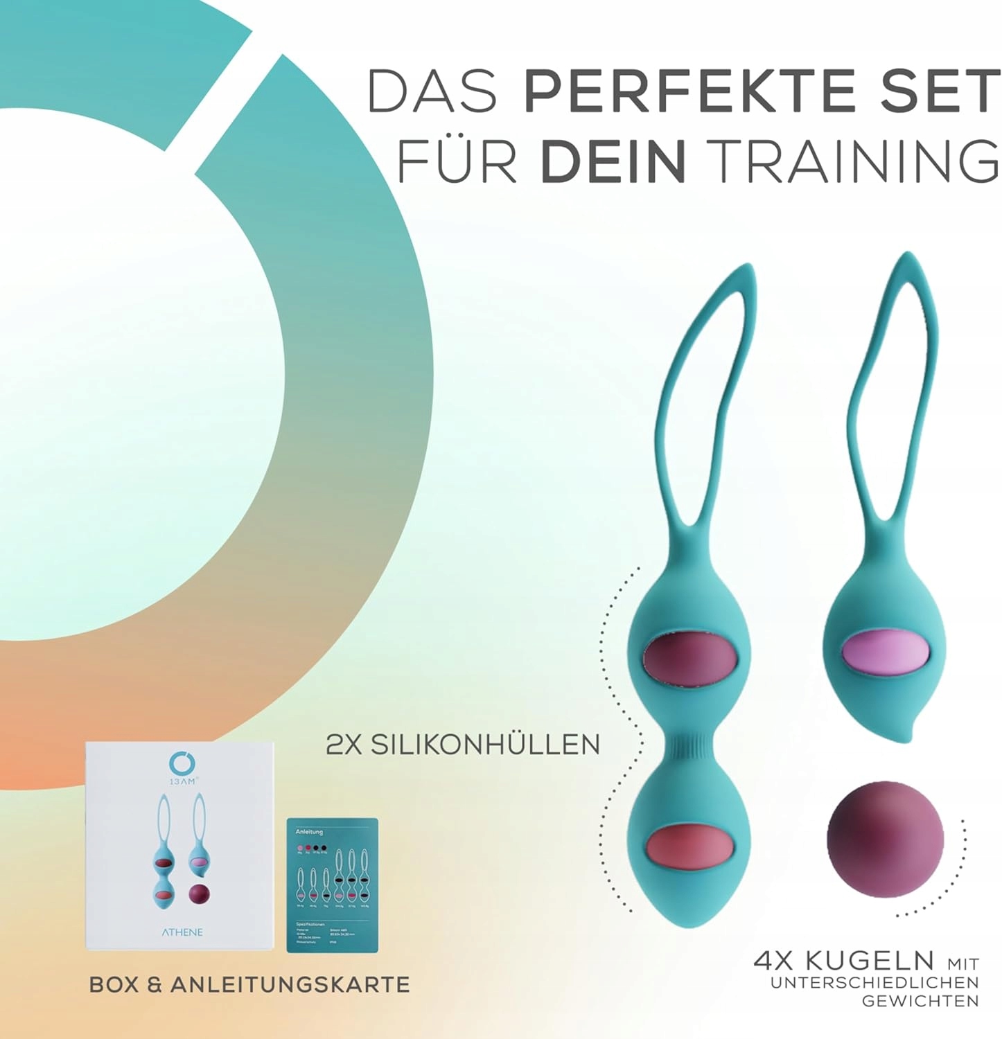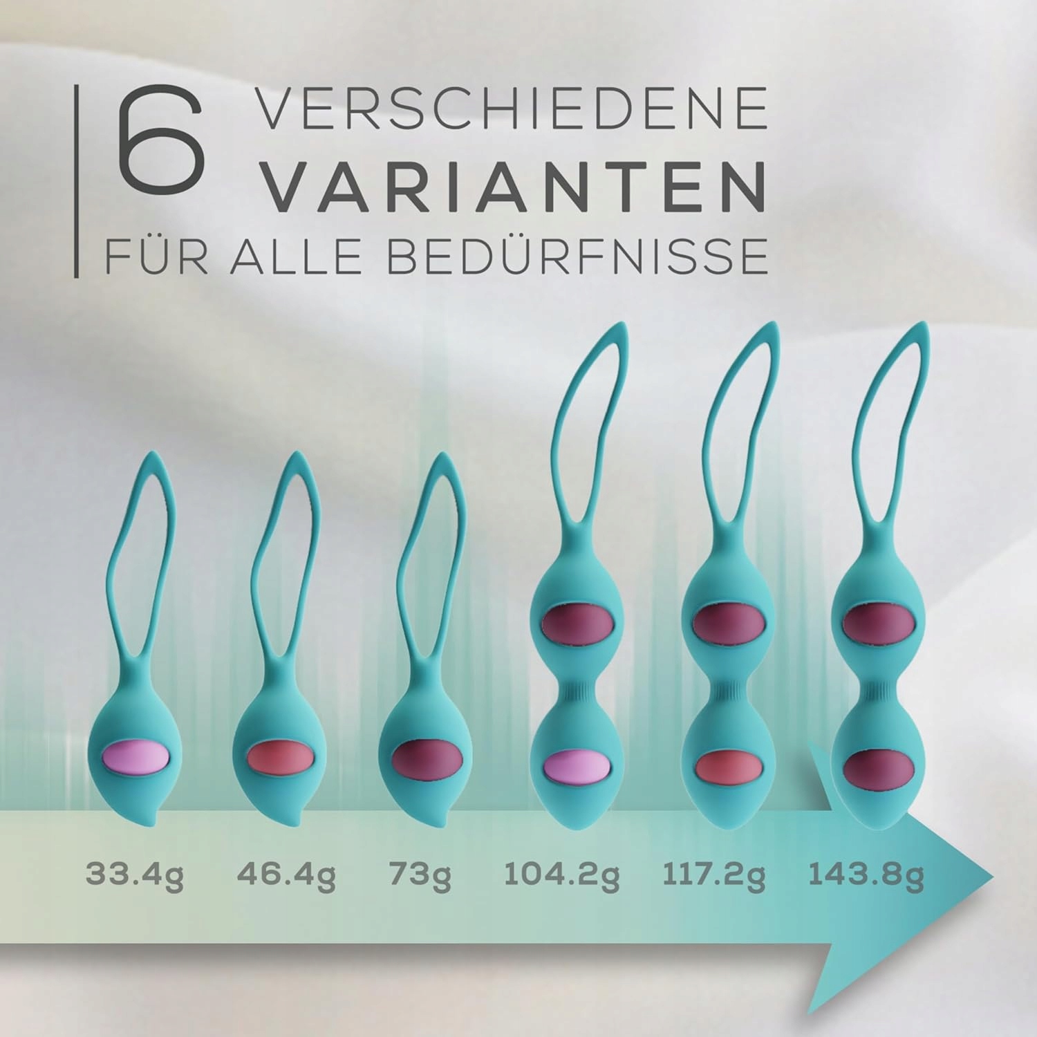 м'ячі для тренування тазового дна забезпечують конденсацію тазу під час використання. 4 м'ячі для тренування тазового дна в розмірах: 30 г, 44 г, 85 г, 165 г; 95 мм x 34 мм підходять для початківців і досвідчених користувачів.