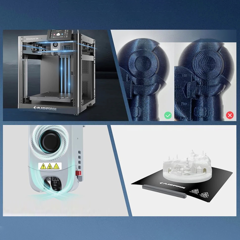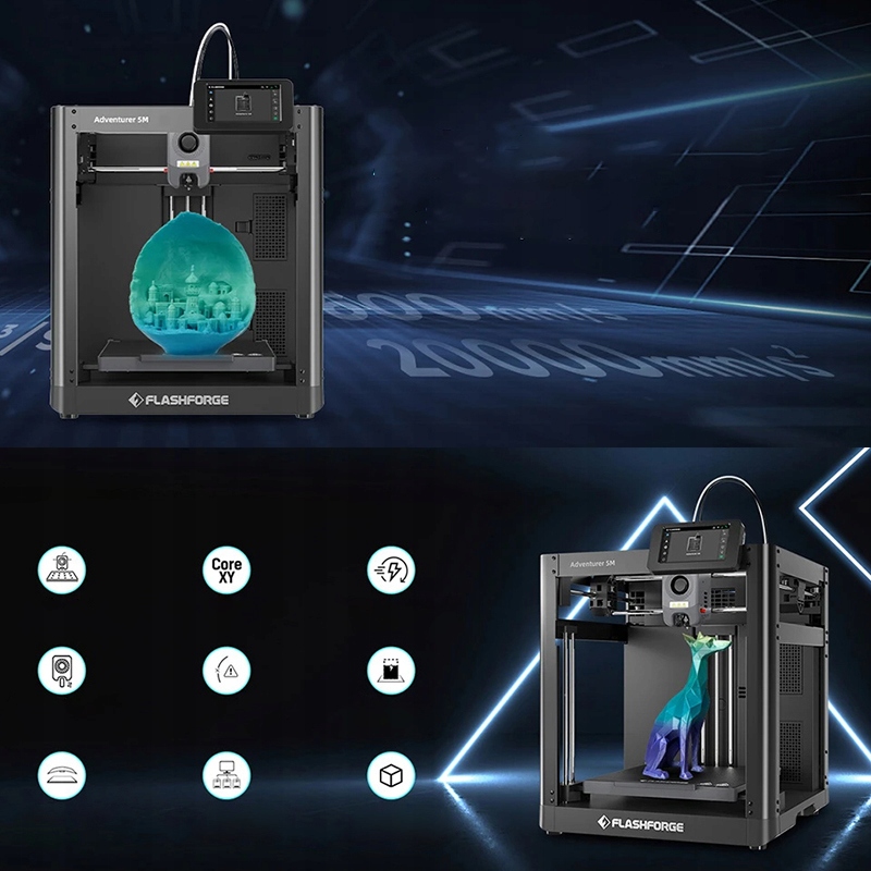 Flashforge Adventurer 5m -це відкритий 3D -принтер, підходить для використання у відкритих та добре провалених умовах. Він характеризується великим об'ємом 220x220x220 мм друку, що дозволяє створити більш складні великі моделі.