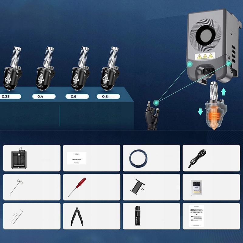 Різні діаметри форсунок (0,25/0,4/0,6/0,8 мм) підходять як для високої точності, так і для високої ефективності. Початок друку повинно бути включено функцією виявлення нитки в інформації про машину.